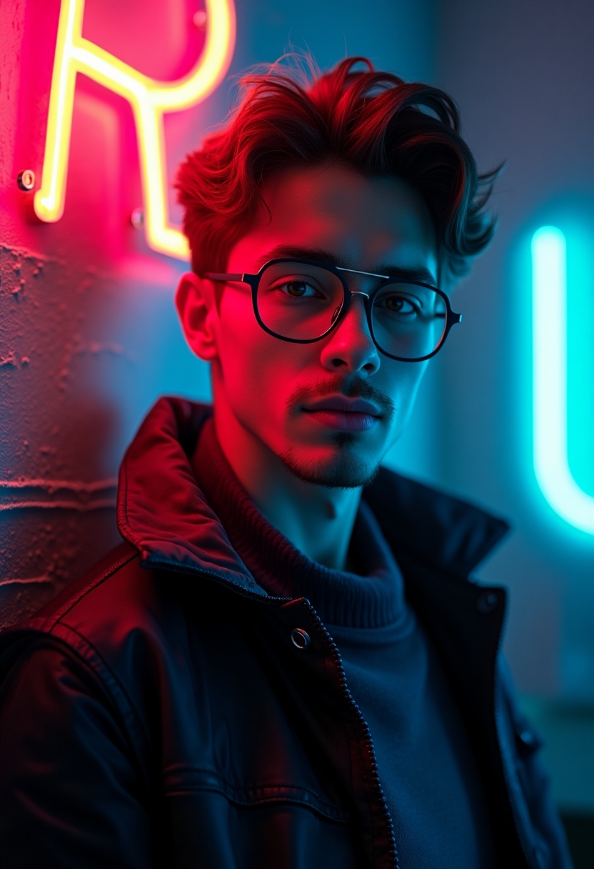 Он в киберпанк-очках с яркими огнями вокруг, позирует рядом с неоновой вывеской