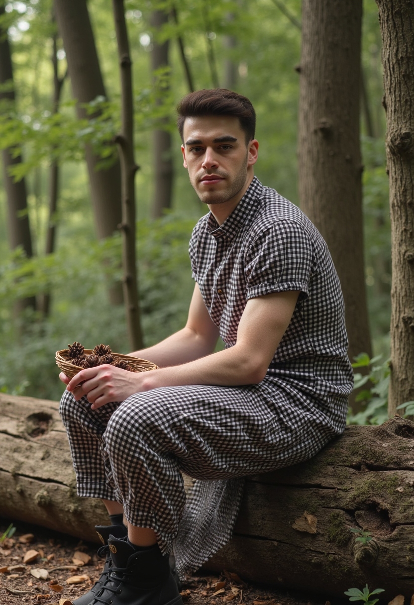 Он в клетчатом костюме сидит на старом бревне в лесу, держит корзинку с шишками