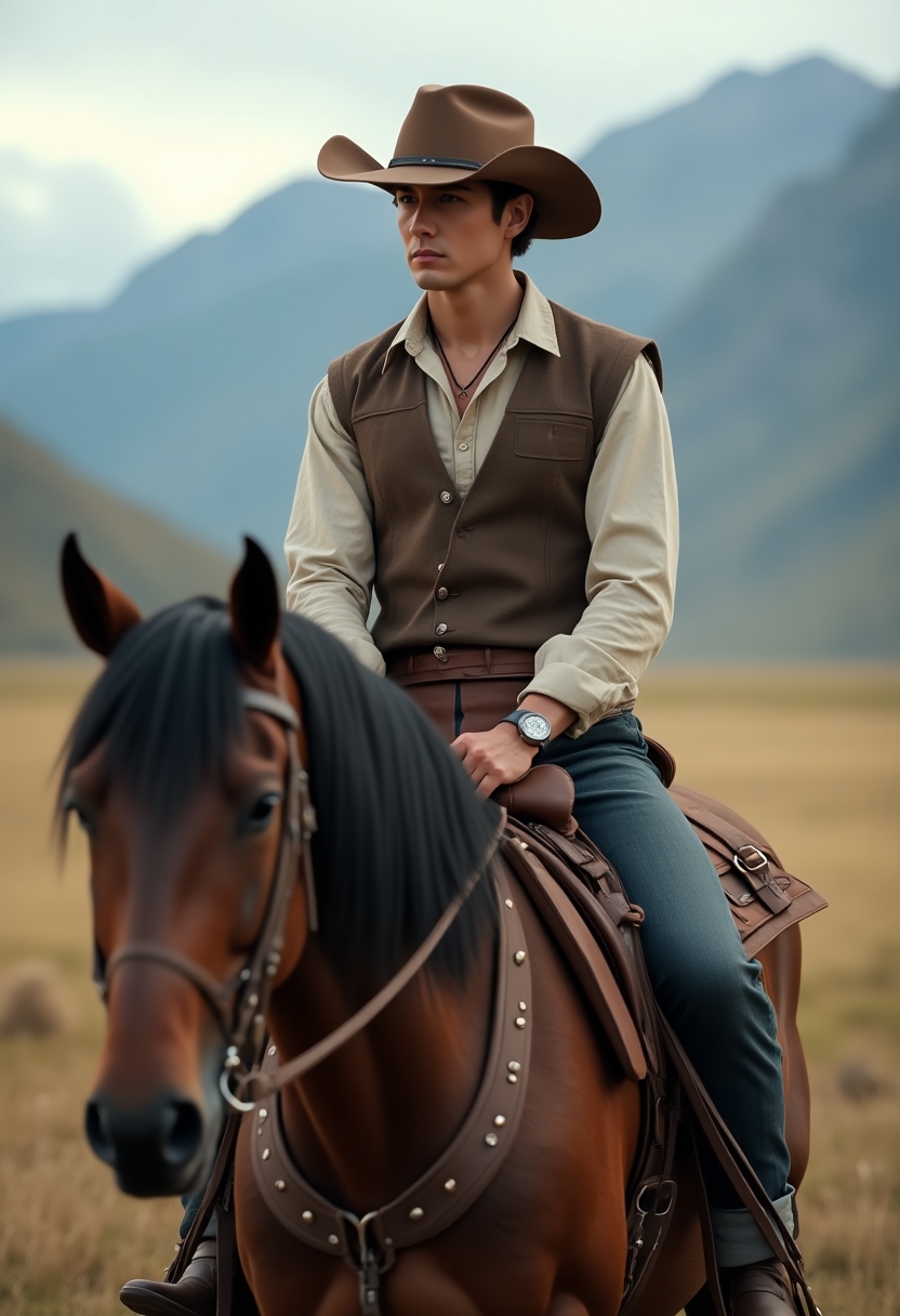 Он верхом на лошади, одет в ковбойский наряд на фоне горного ландшафта