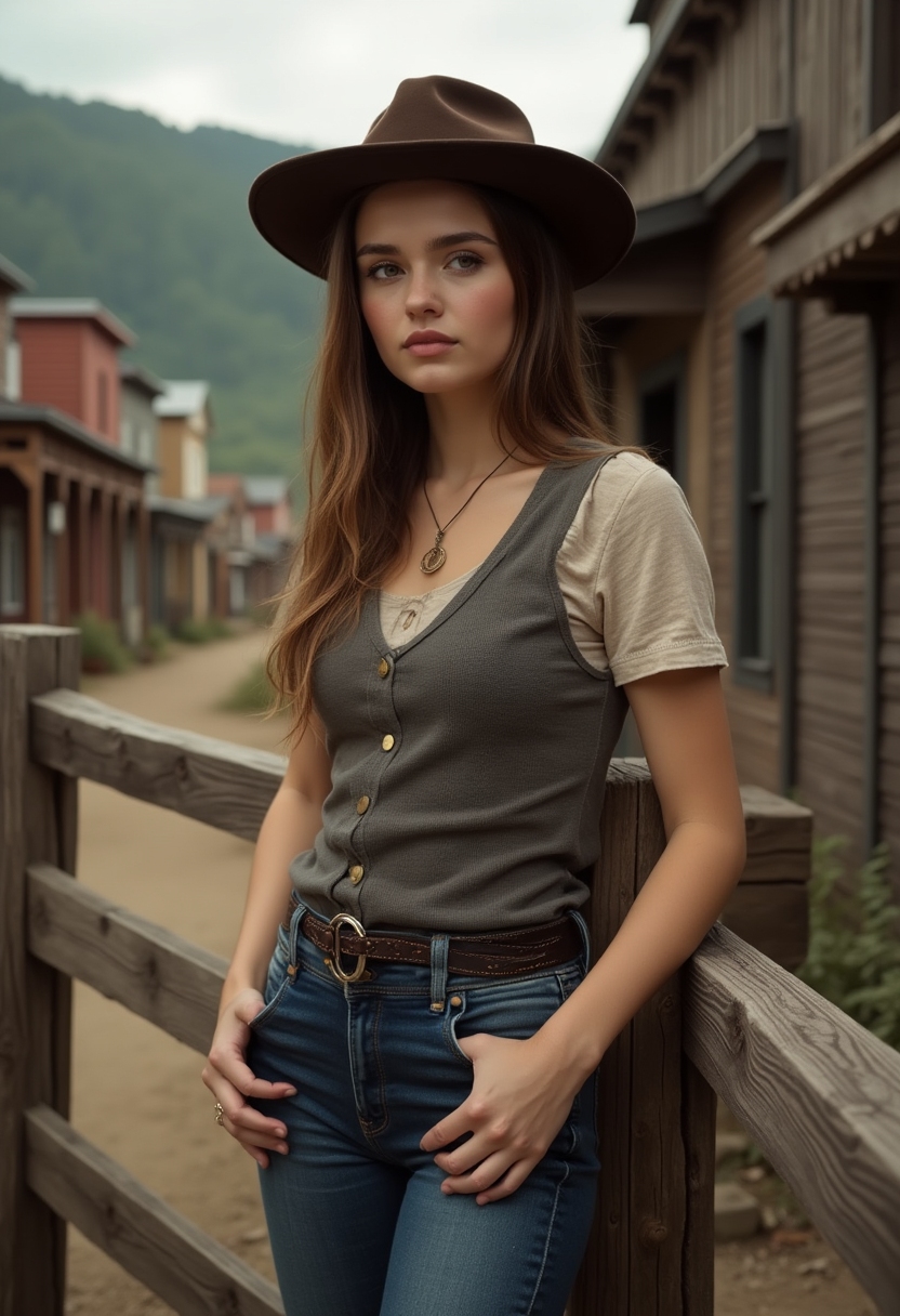 Она позирует рядом с деревянным забором на фоне старого города в стиле вестерн