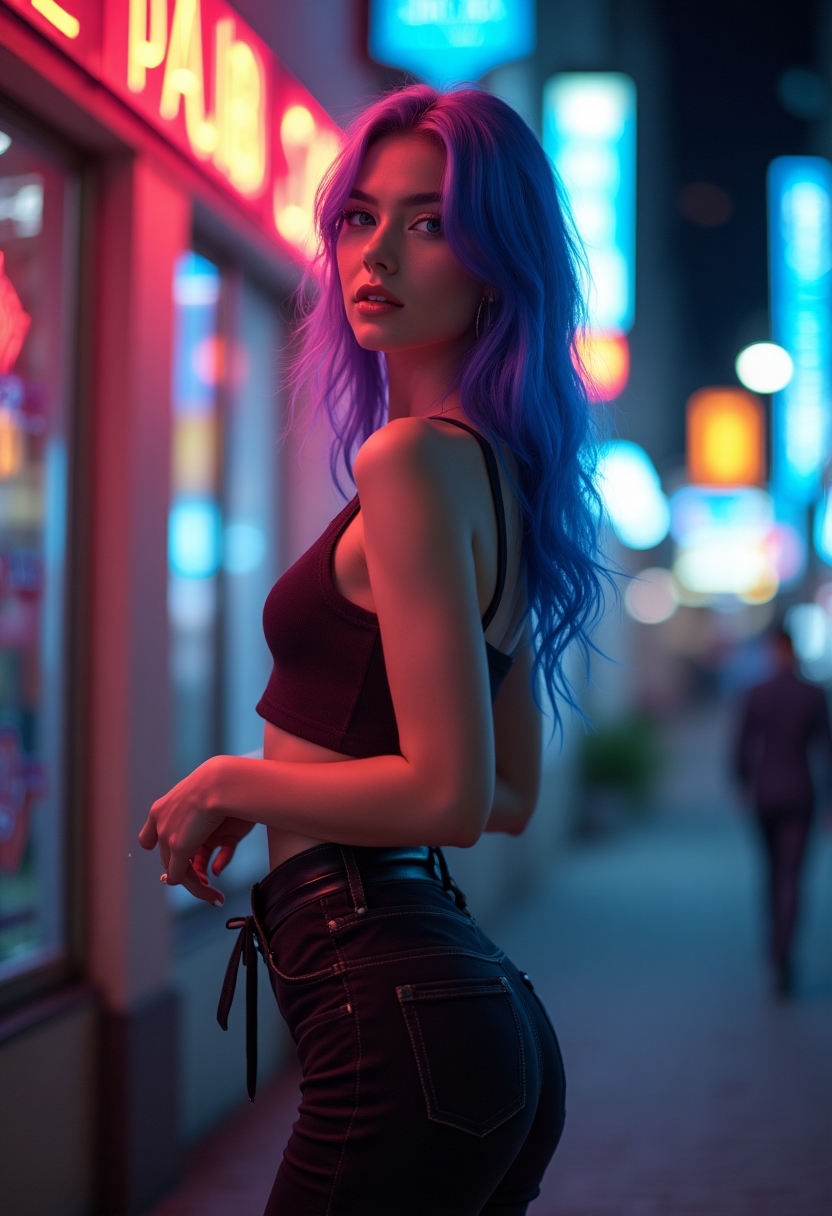 Она с фиолетовыми и синими волосами, окружённая неоновыми знаками и вывесками
