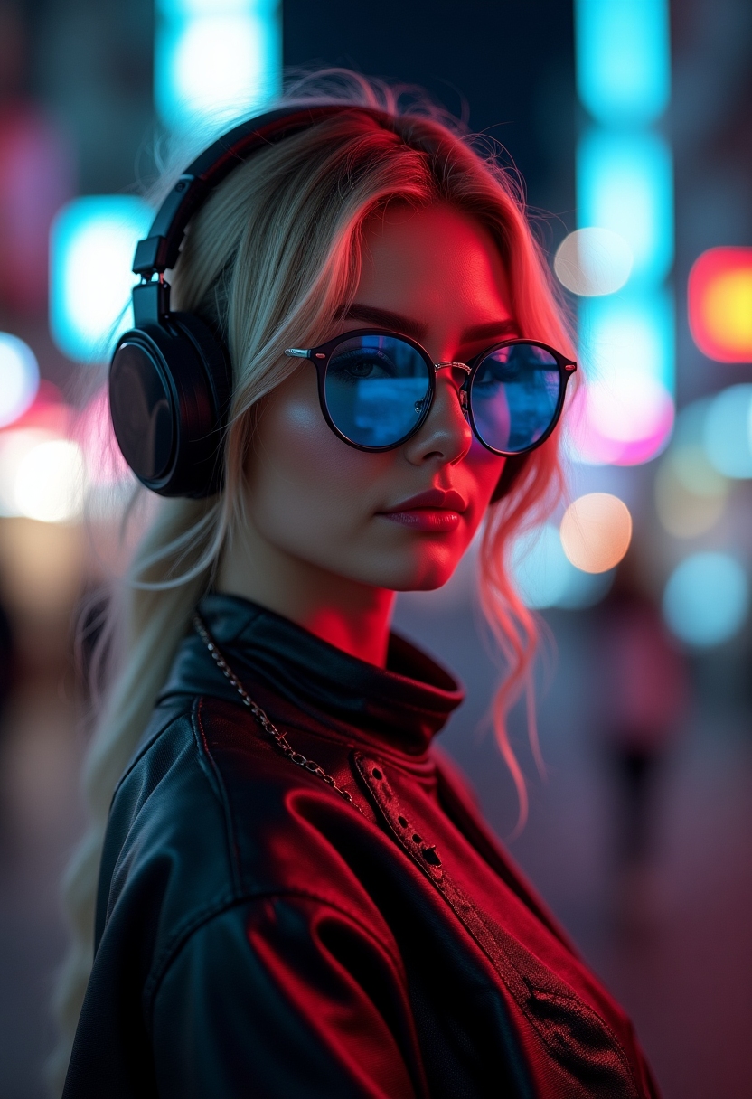 Примерить образ на себеОна в кожаной куртке с яркими светящимися вставками, на фоне переулка с неоновыми огнями