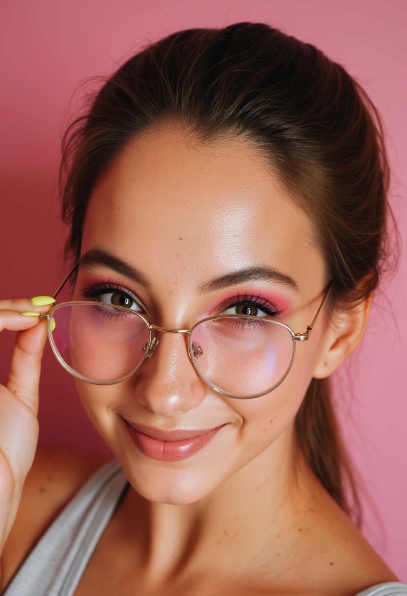 Она слегка приподнимает руками очки в форме сердца с розовыми линзами, которые отражают свет, добавляя лёгкую кокетливость образу. Взгляд направлен в камеру. Ультрареалистичный портрет крупным планом в разрешении 8K: выразительные розовые тени на веках, драматичные черные подводки для глаз, длинные объемные ресницы и мягкие розовые губы. На фоне насыщенный розовый цвет, гармонирующий с образом. Кожа сияет перламутровым блеском, создавая эффект нежного гламура. Модный, потрясающий, настоящий шедевр.