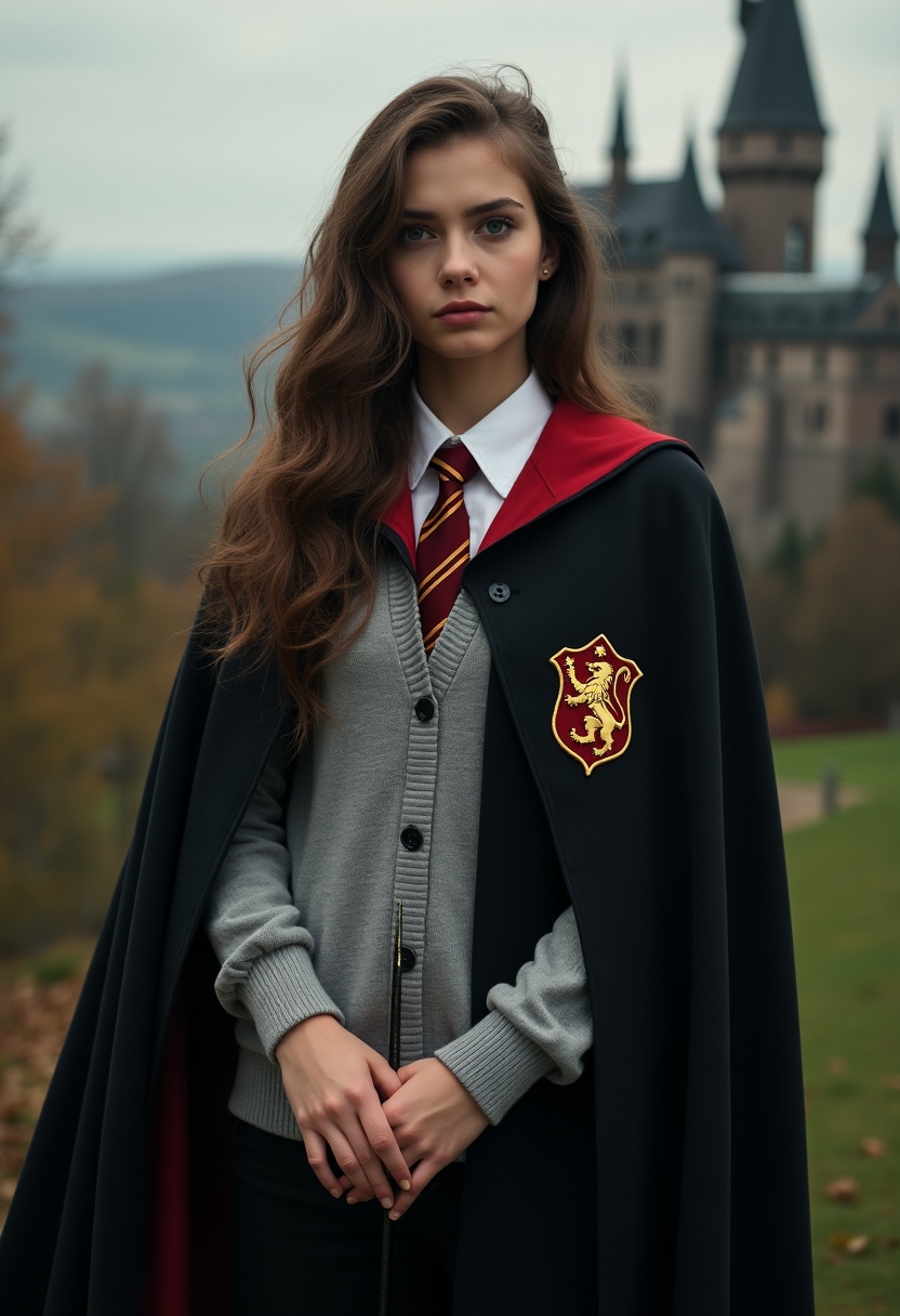 Она в чёрной мантии с красно-золотой подкладкой и эмблемой льва, в сером кардигане, белой рубашке и красно-золотом галстуке на фоне Хогвартса. В руках у неё волшебная палочка
