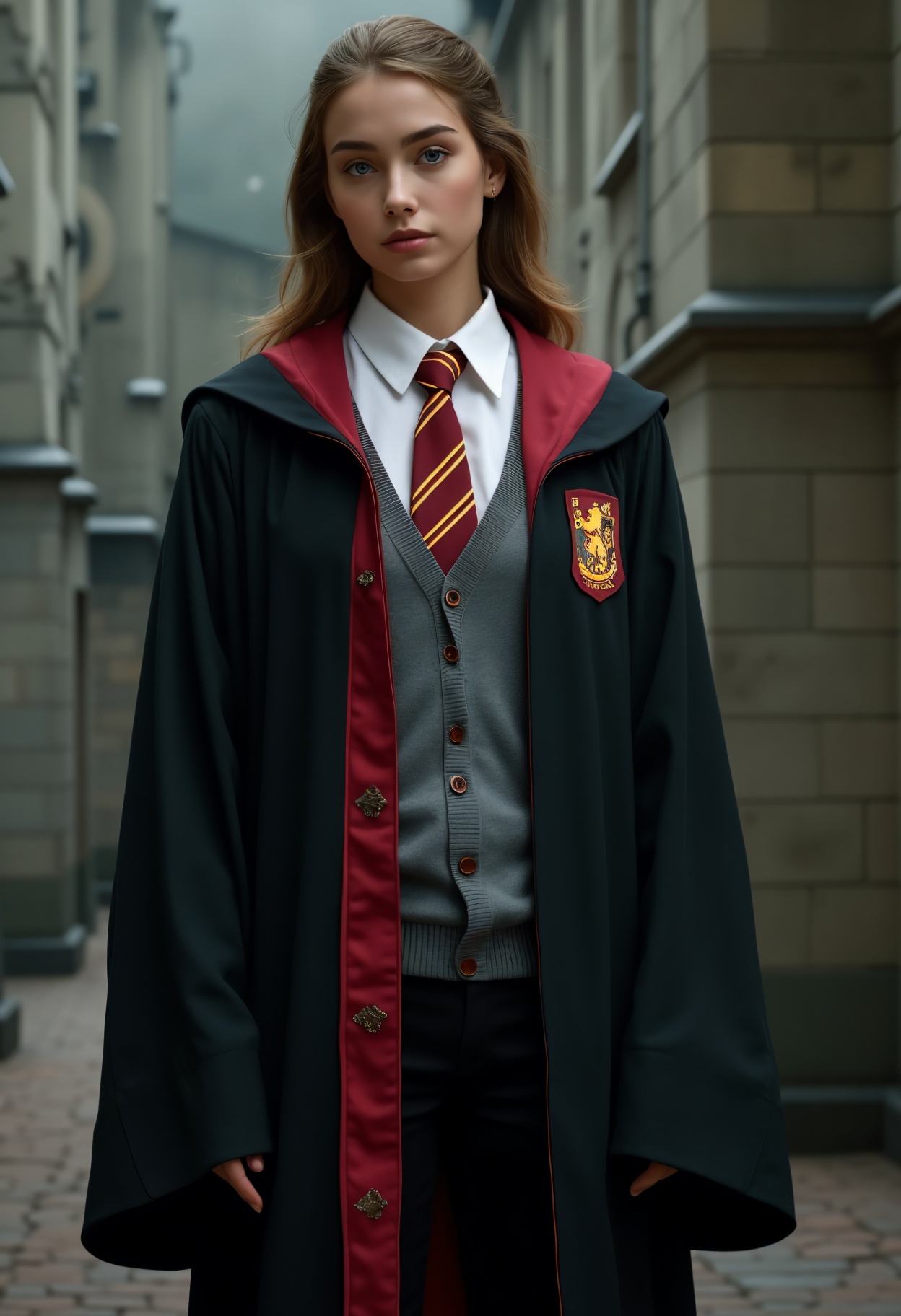 Она в чёрной мантии с красно-золотой подкладкой и эмблемой льва, в сером кардигане, белой рубашке и красно-золотом галстуке на фоне Хогвартса.