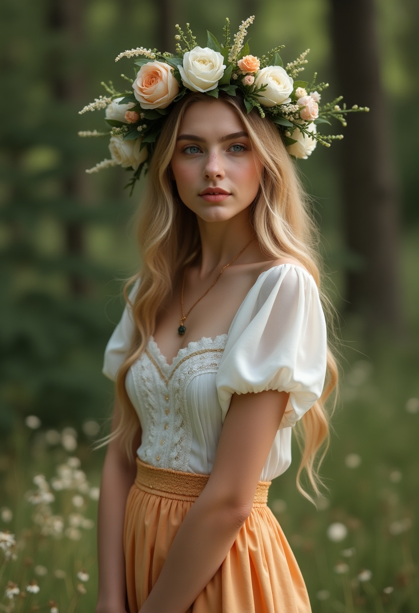 Она в длинной развевающейся юбке и с цветочным венком на голове на фоне природы