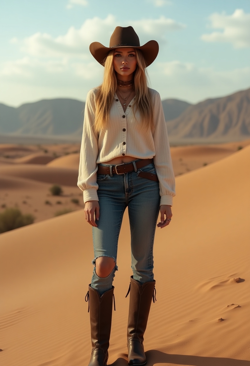 Она в ковбойской шляпе и кожаных сапогах на фоне пустынного пейзажа