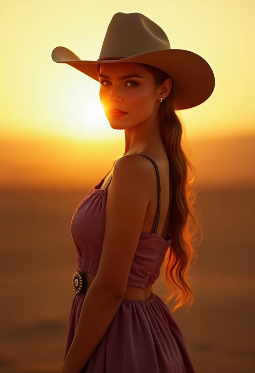 Она в платье и ковбойской шляпе, стоит на фоне заката в пустыне