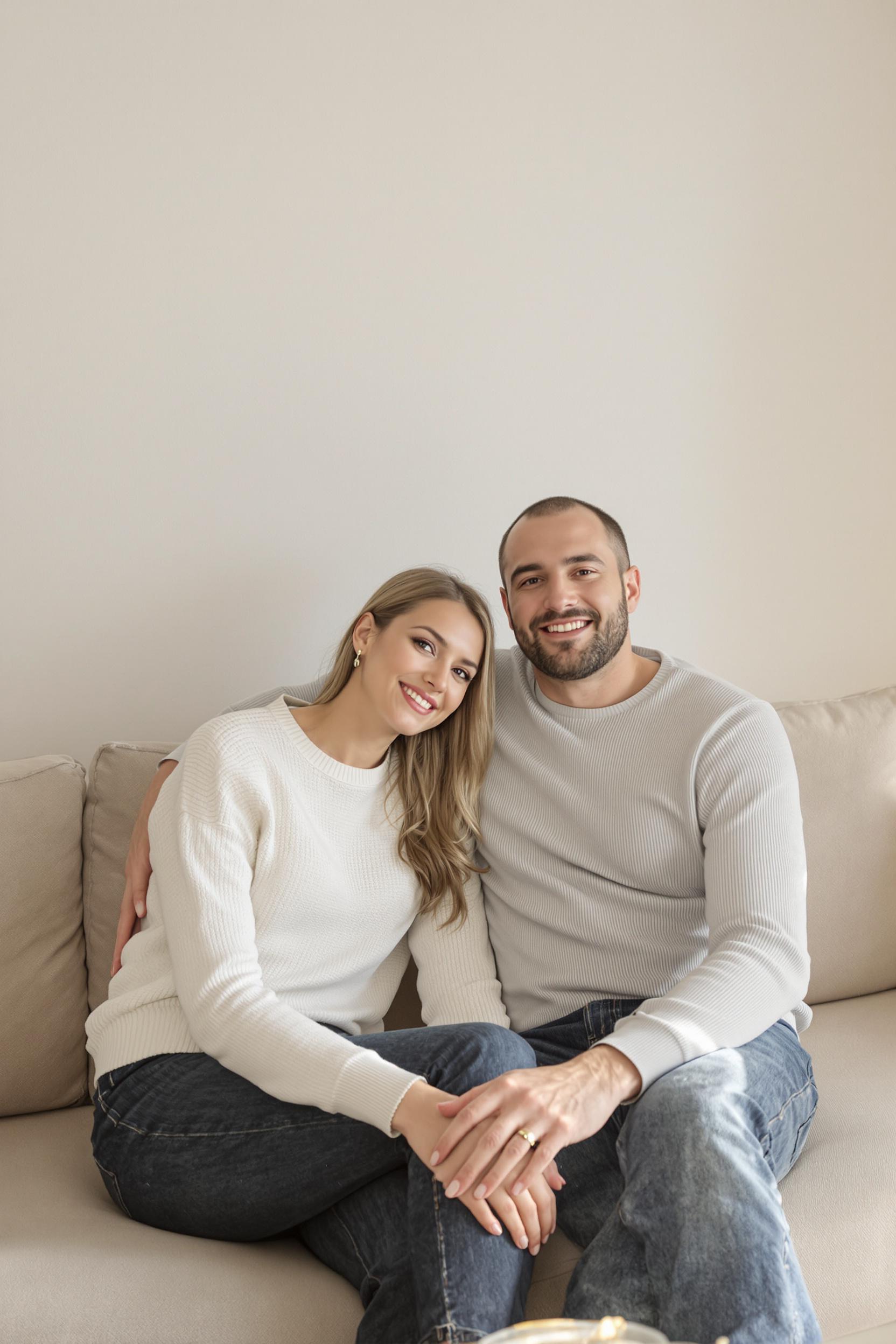 Пара — девушка и парень — сидят вместе на светлом диване в минималистичной студии, смотрят в объектив, дружелюбные улыбки, между ними ощущение теплоты и поддержки, натуральное освещение, мягкие тёплые тона, изящный уютный интерьер.