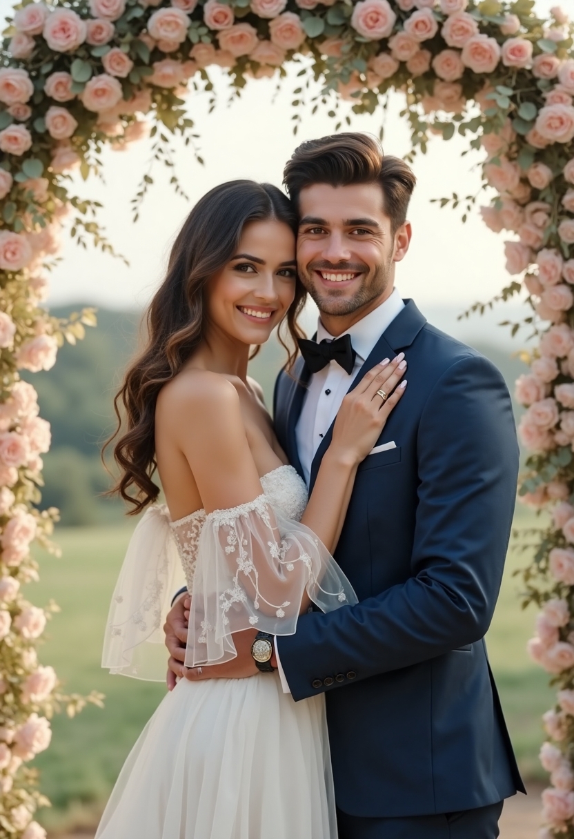 Пара молодожёнов: девушка в изящном платье с длинными полупрозрачными рукавами и цветочным поясом, парень в тёмно-синем костюме и бабочке. Они стоят среди арки из нежных пастельных цветов, обнявшись, оба смотрят в камеру, сияя радостью.