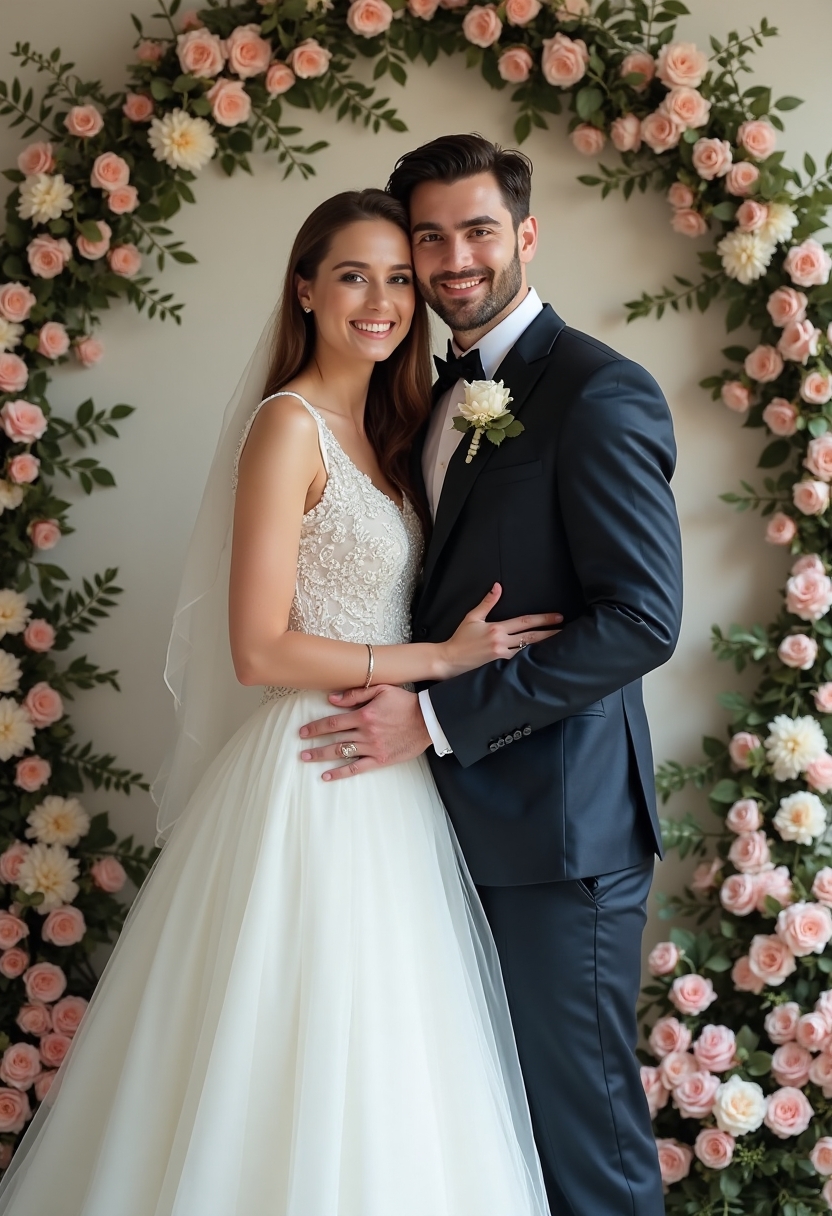 Пара молодожёнов в элегантных свадебных нарядах стоит на фоне декоративной стены, украшенной цветочными гирляндами. Оба счастливо улыбаются и смотрят прямо в камеру, плечом к плечу, вокруг множество свежих цветов, атмосфера нежности.
