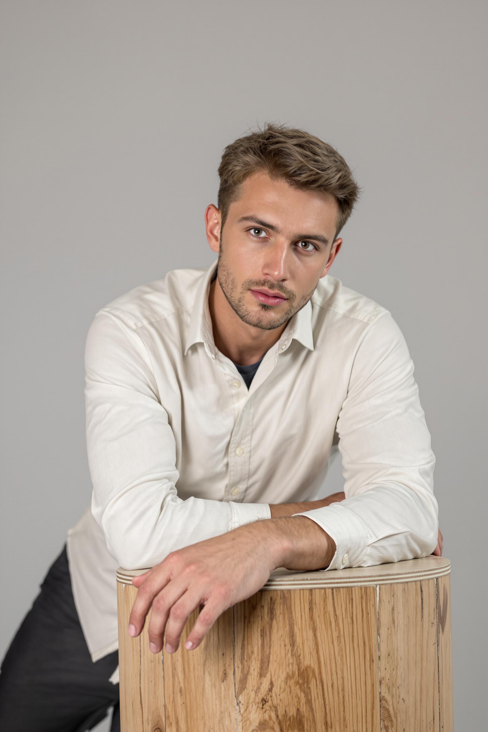 Мужчина в лаконичной светлой рубашке полулежит на белой циклораме, опираясь на минималистичный деревянный цилиндр. Он смотрит прямо в камеру, руки свободно лежат на цилиндре, спокойная поза, атмосфера чистого мужского минимализма.