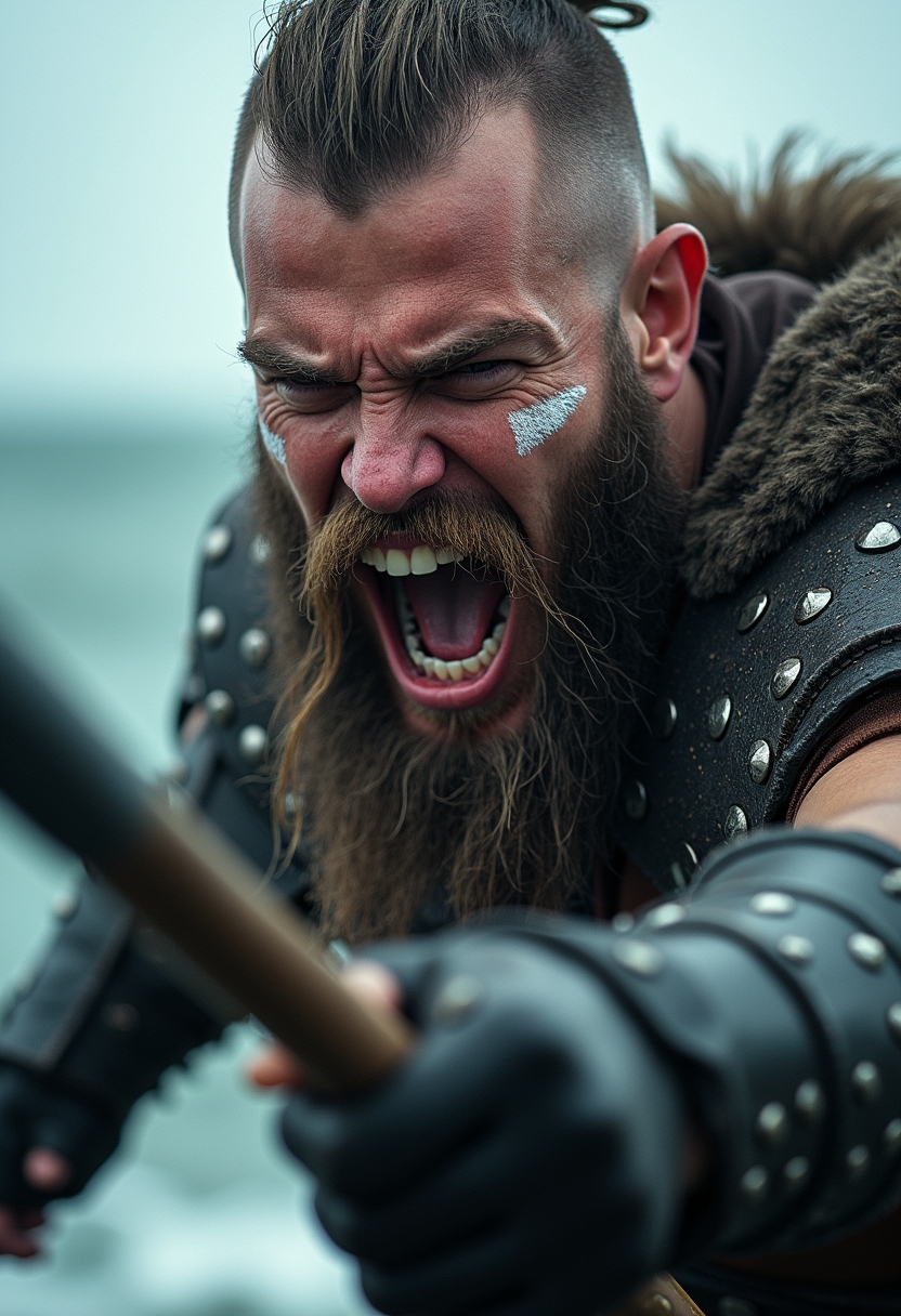 Портрет могучего викинга, крупным планом. Он изображен в момент яростного нападения, его лицо искажено криком, рот открыт, зубы видны. Викинг одет в кольчугу и кожаный доспех, украшенный металлическими заклепками. Его длинная борода и усы растрепаны. На лице видны белые боевые раскраски. Волосы коротко подстрижены и уложены в высокую прическу. Он держит в руке какое-то оружие (возможно, копье или топор), направленное прямо на зрителя. Свет на фотографии драматичный, с акцентом на лице и оружии, создавая ощущение движения и напряжения. Фон размыт, но можно различить бурное море и падающий дождь, что усиливает атмосферу бури и битвы. Общая атмосфера изображения — это сила, ярость и дикость, свойственные образам викингов.