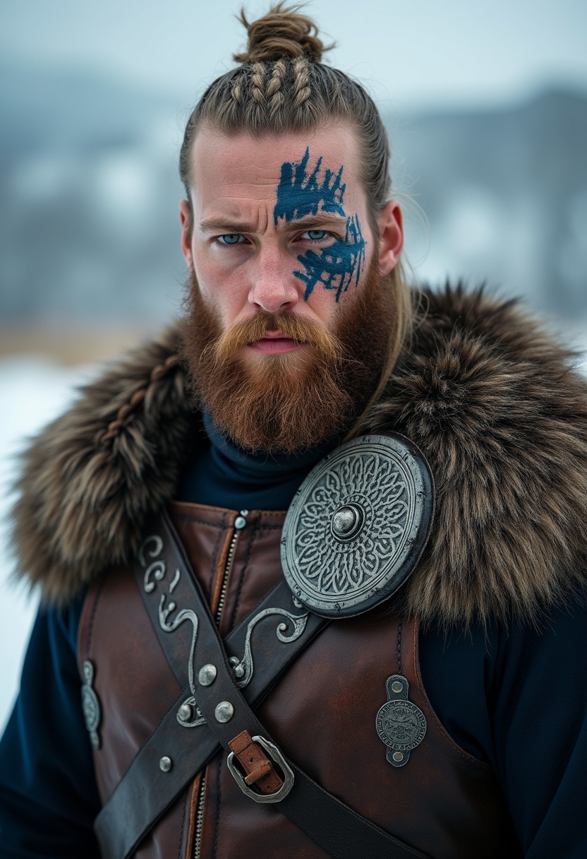 Портрет мужчины, одетого в костюм, стилизованный под одежду викинга. Мужчина имеет светлую кожу, густую бороду и сложную прическу с косами. На его лице нанесен боевой раскрас в виде синих и чёрных узоров, скрывающих часть лица вокруг глаз. Взгляд у него серьёзный, пристальный. Костюм состоит из меховой накидки, кожаного доспеха с металлическими элементами и замысловатыми орнаментами в кельтском стиле. Одежда выглядит грубой, но тщательно сделанной. На плече виден большой металлический оберег. Цветовая гамма фотографии тёмная, преобладают коричневые, серые и чёрные тона, которые контрастируют с голубыми глазами мужчины и сине-чёрными элементами боевой раскраски. Фон размыт и представляет собой снежный пейзаж, что создаёт атмосферу суровости и эпичности. Освещение сфокусировано на лице и фигуре мужчины, создавая эффект драматического портрета. Поза мужчины напряжена, он смотрит прямо на зрителя, что усиливает ощущение силы и решимости.