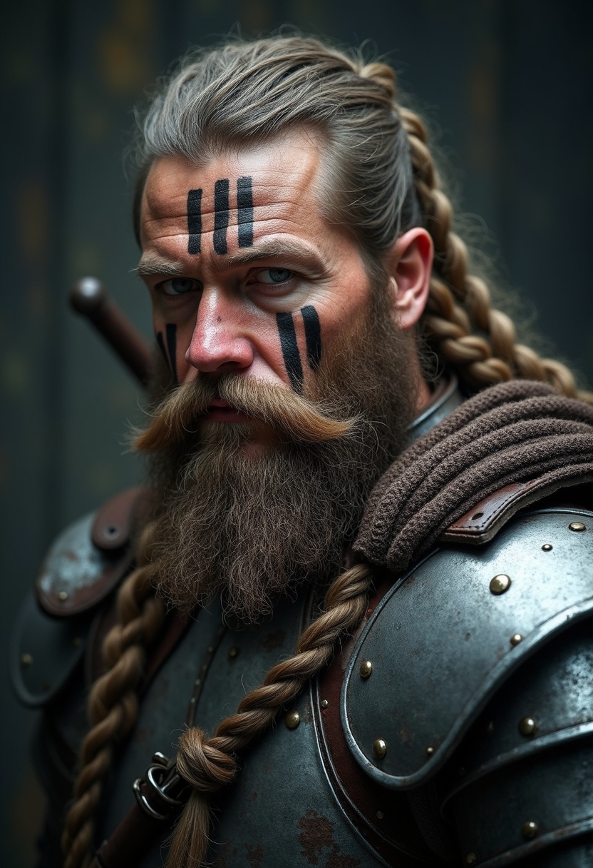 Портрет сурового мужчины, облаченного в доспехи, напоминающие одежду древних воинов-викингов. Его лицо покрыто боевой раскраской, состоящей из темных линий и символов, которые нанесены на кожу лица и головы. У него длинная, борода, заплетенная в косу, и длинные волосы, частично собранные под металлическим обручем, украшенным орнаментом. Взгляд мужчины строг и сосредоточен, он смотрит прямо на зрителя. Его доспехи выглядят потрепанными и изношенными, сочетая металл и кожу, что добавляет реалистичности образу. Освещение на фотографии драматичное, с акцентом на лице и плечах персонажа, а фон остается темным и размытым, что усиливает концентрацию внимания на самом воине. Атмосфера изображения тяжелая, мрачная и эпическая, создавая ощущение силы, опыта и некоторой меланхолии. На плече виднеется часть оружия или снаряжения.