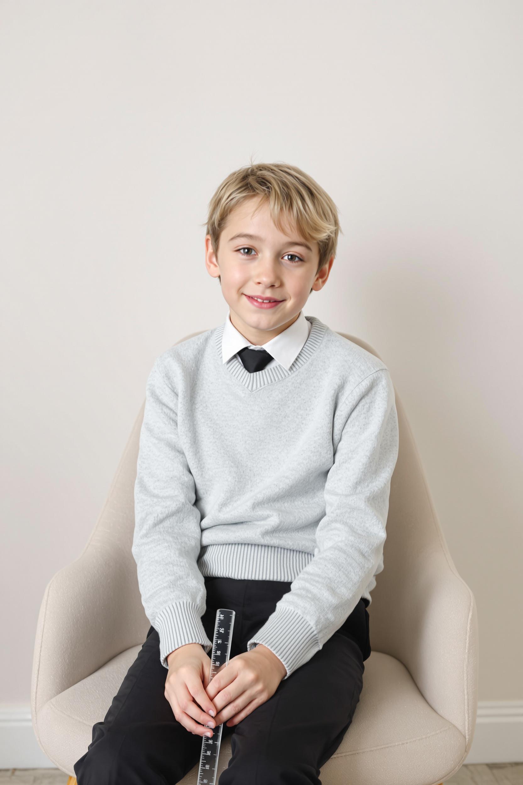 Ребёнок одет в лаконичный светло-серый джемпер и строгие чёрные брюки, сидит вполоборота на элегантном простом стуле. В руках держит прозрачную линейку, минималистичный фон, взгляд прямо в камеру, средний план, атмосфера начала учебного года.