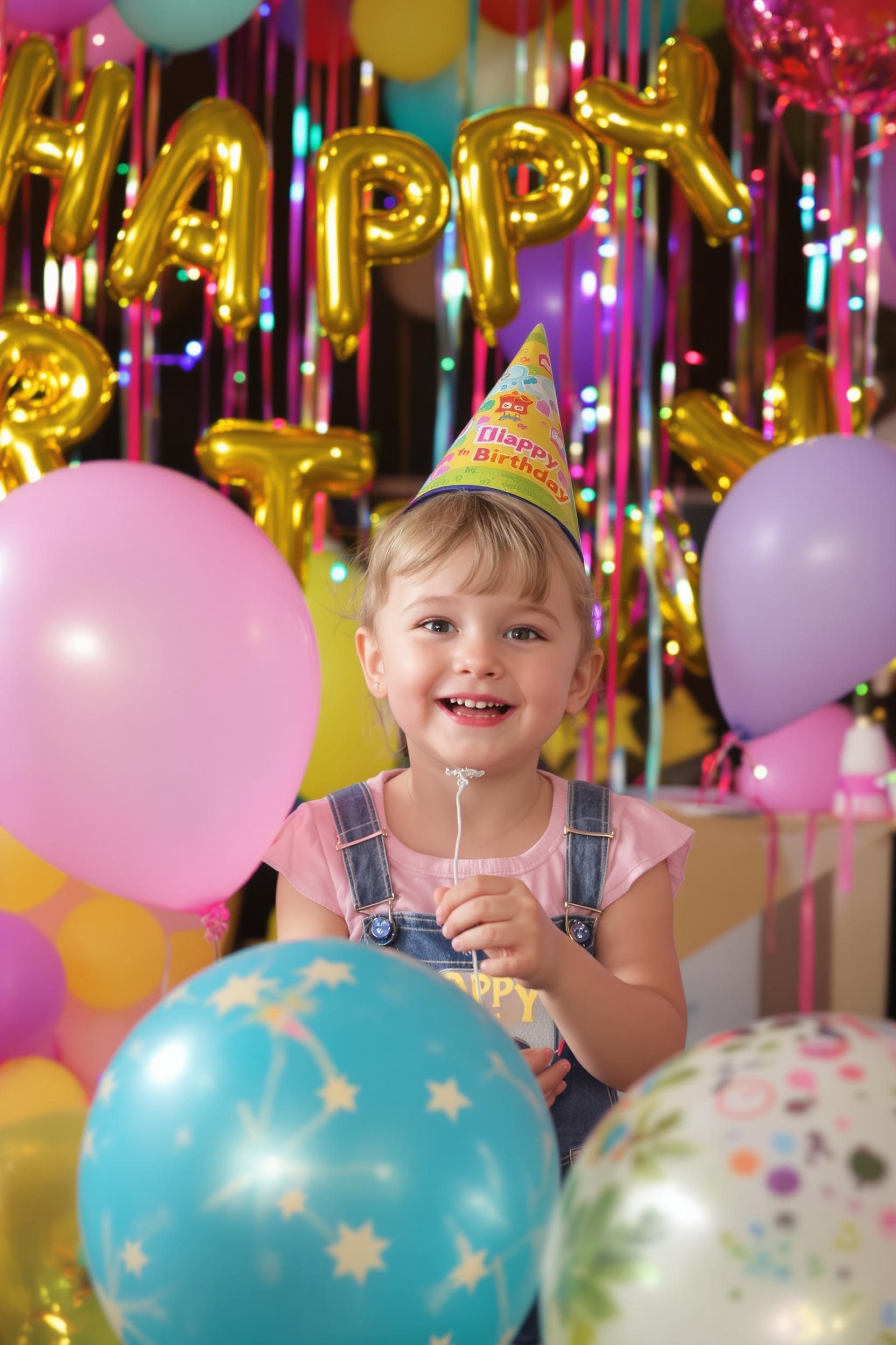 Ребенок празднует день рождения, улыбается и смотрит в камеру, в руках воздушные шары, вокруг яркий праздничный декор, шарики, гирлянды, атмосфера радости и веселья, естественное освещение.