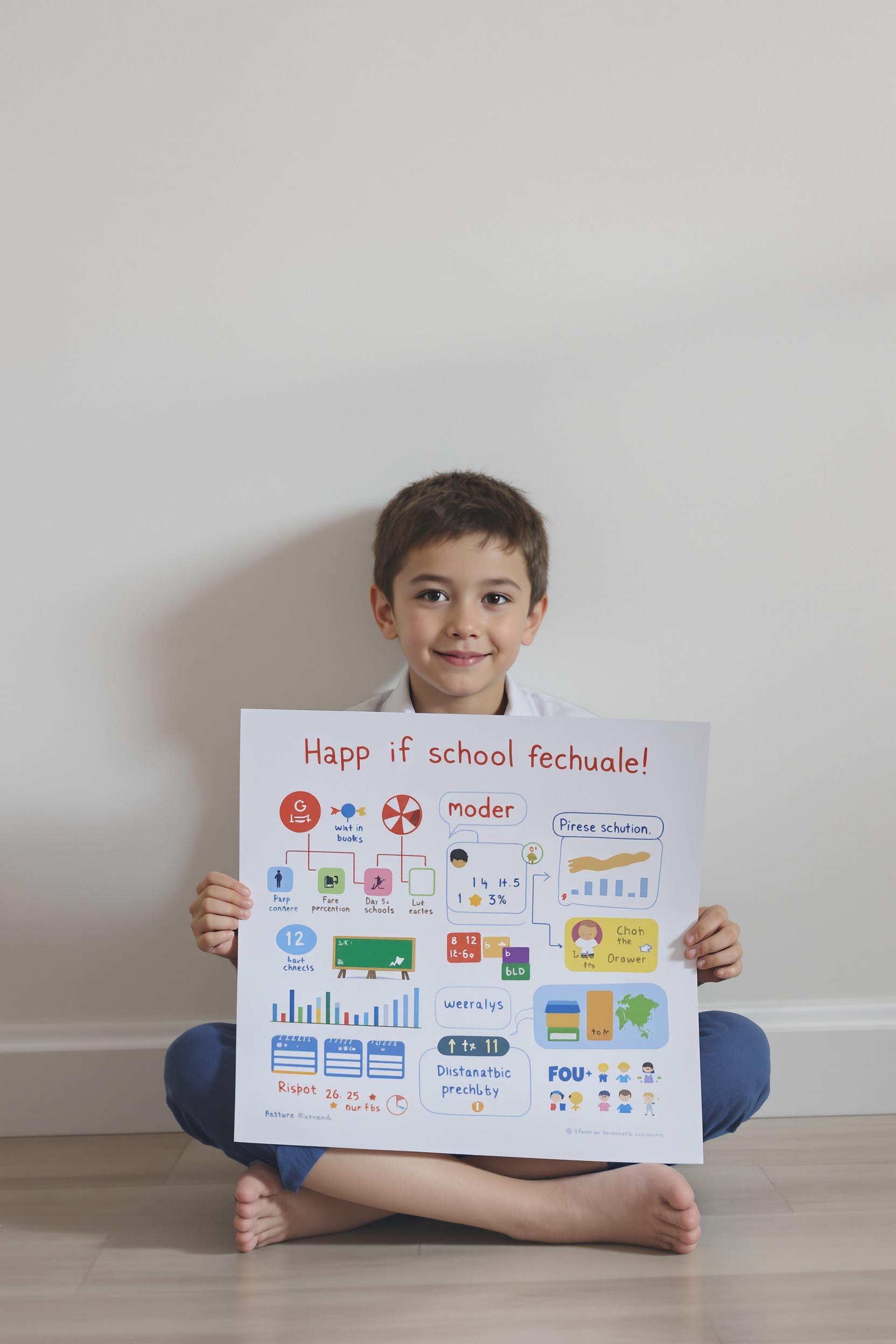 Ребёнок в аккуратной белой рубашке с коротким рукавом и синими брюками, сидит на полу, ноги скрещены, на фоне минималистичной светлой стены, в руках держит большой яркий учебный плакат, средний план, уверенно смотрит прямо в камеру, ощущение школьного вдохновения.