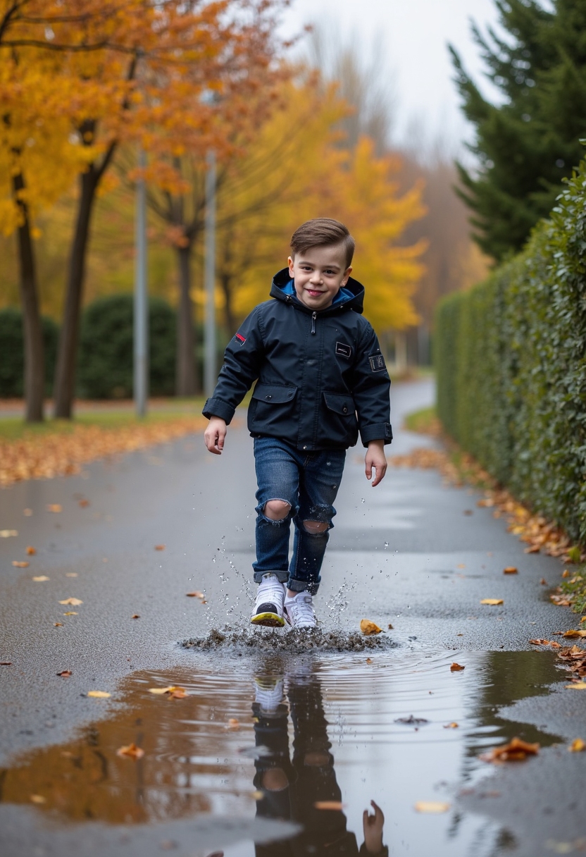 Ребенок в дождевике прыгает в лужу на фоне осенней аллеи с широкой улыбкой