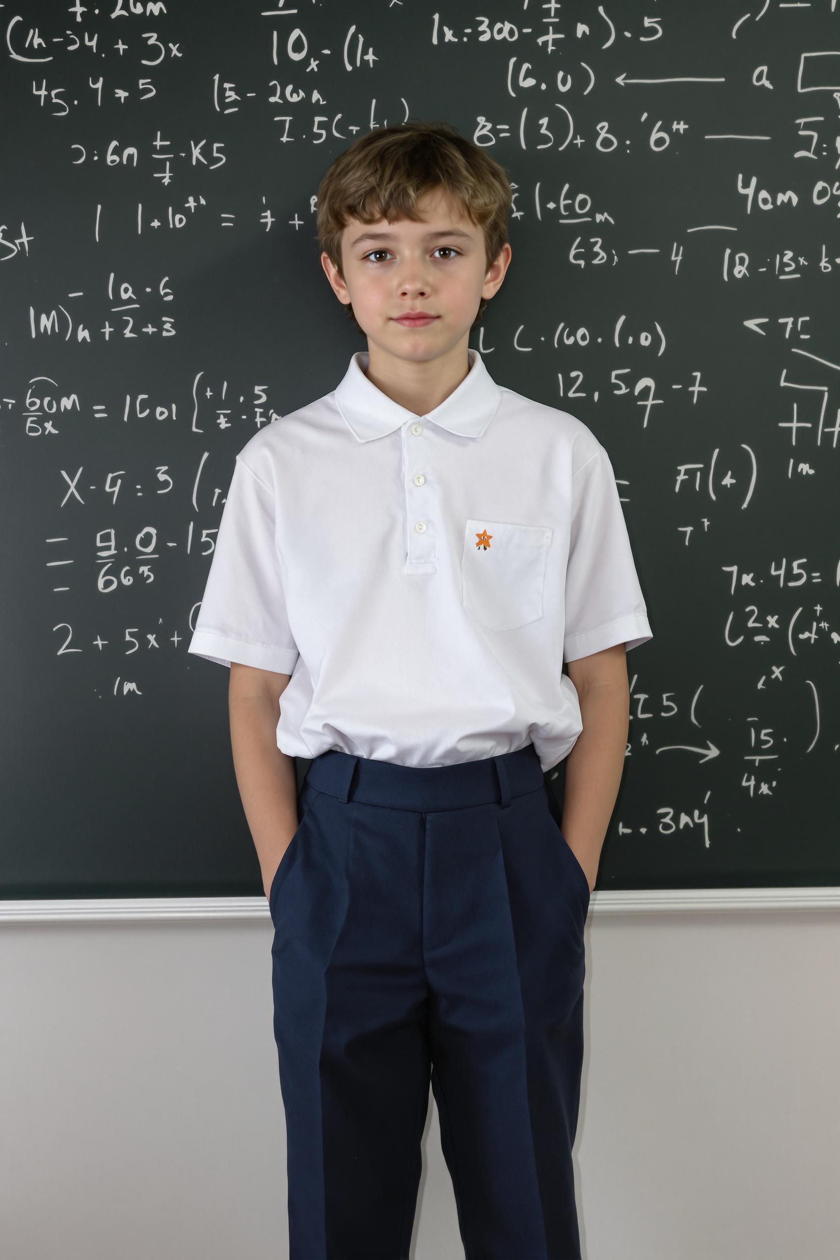 Ребёнок в хорошо выглаженной белой рубашке-поло и тёмно-синих классических брюках, без лишних деталей. На фоне школьной доски с написанными на ней математическими формулами, средний план, минималистичный стиль, ребёнок смотрит прямо в объектив камеры.