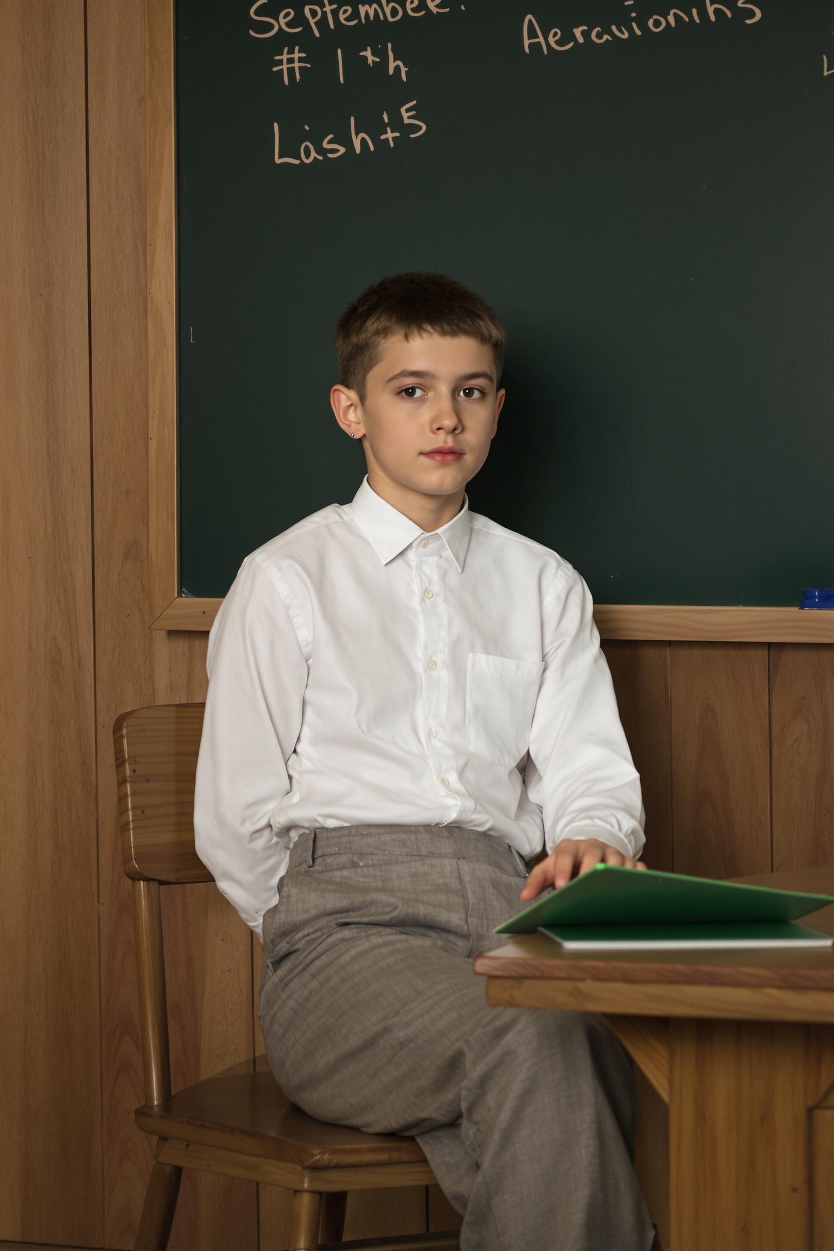 Ребёнок в классической белой рубашке с длинным рукавом, аккуратно заправленной в строгие серые брюки, сидит боком на деревянной партe. В руках держит зелёную школьную доску для записей, средний план, прямой взгляд в камеру, настроение 1 сентября.