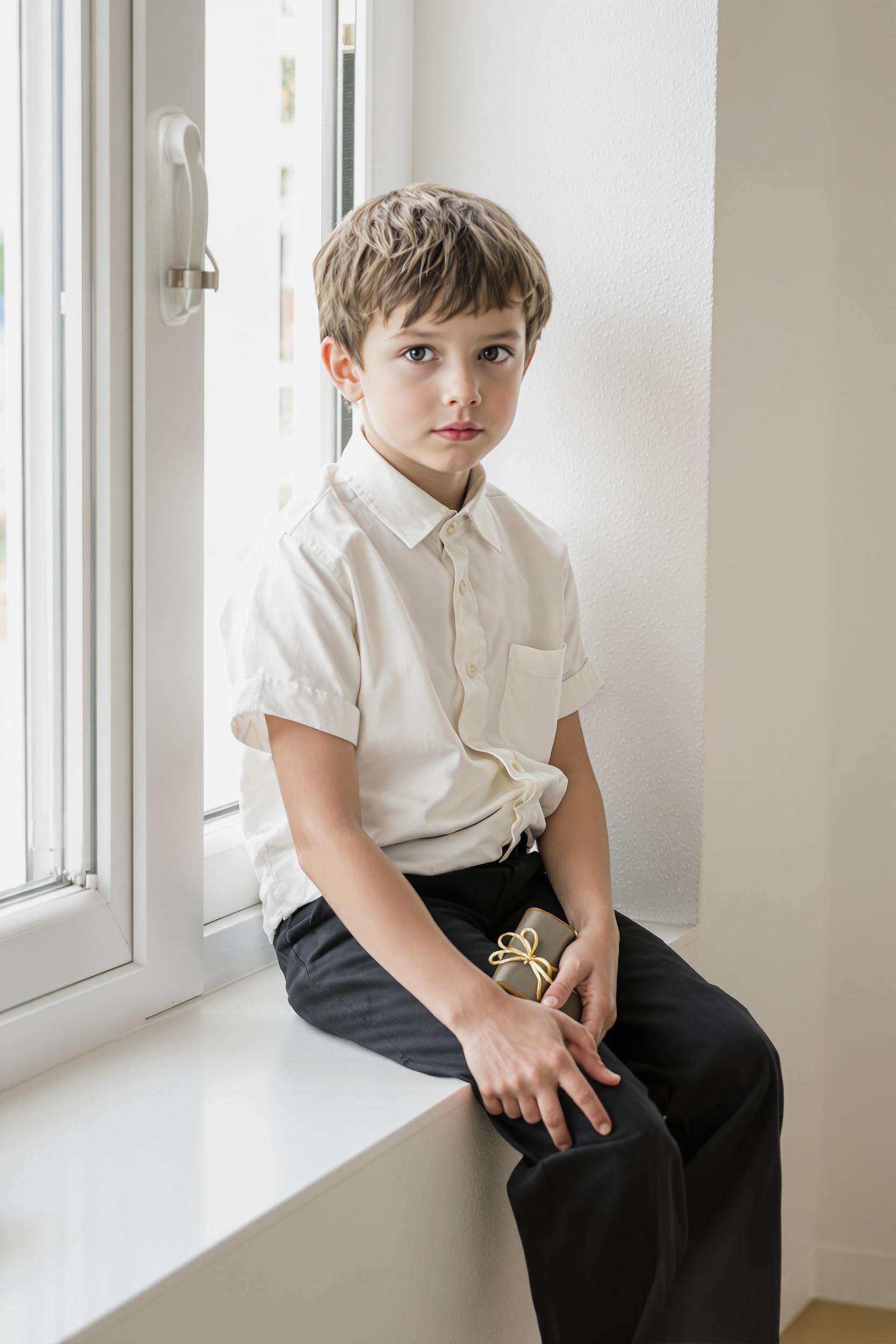Ребёнок в классической светлой рубашке с коротким рукавом и лаконичными черными брюками, сидит на светлом минималистичном подоконнике. В руках держит аккуратно завязанный пенал, средний план, пристальный взгляд в камеру, атмосфера 1 сентября.