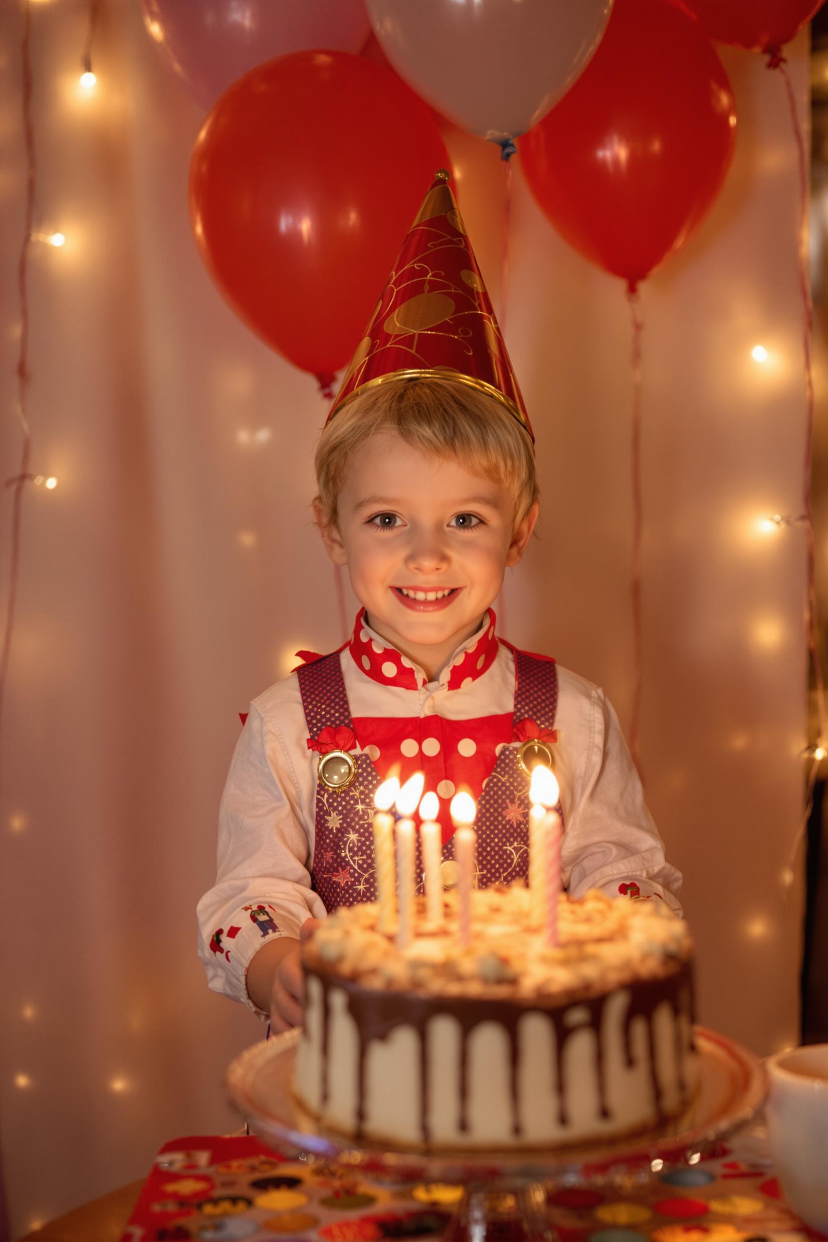 Ребенок в праздничной одежде стоит у украшенного шарами стола, держит торт с зажженными свечами, радостно улыбается и смотрит прямо в камеру, теплое освещение, атмосфера праздника.
