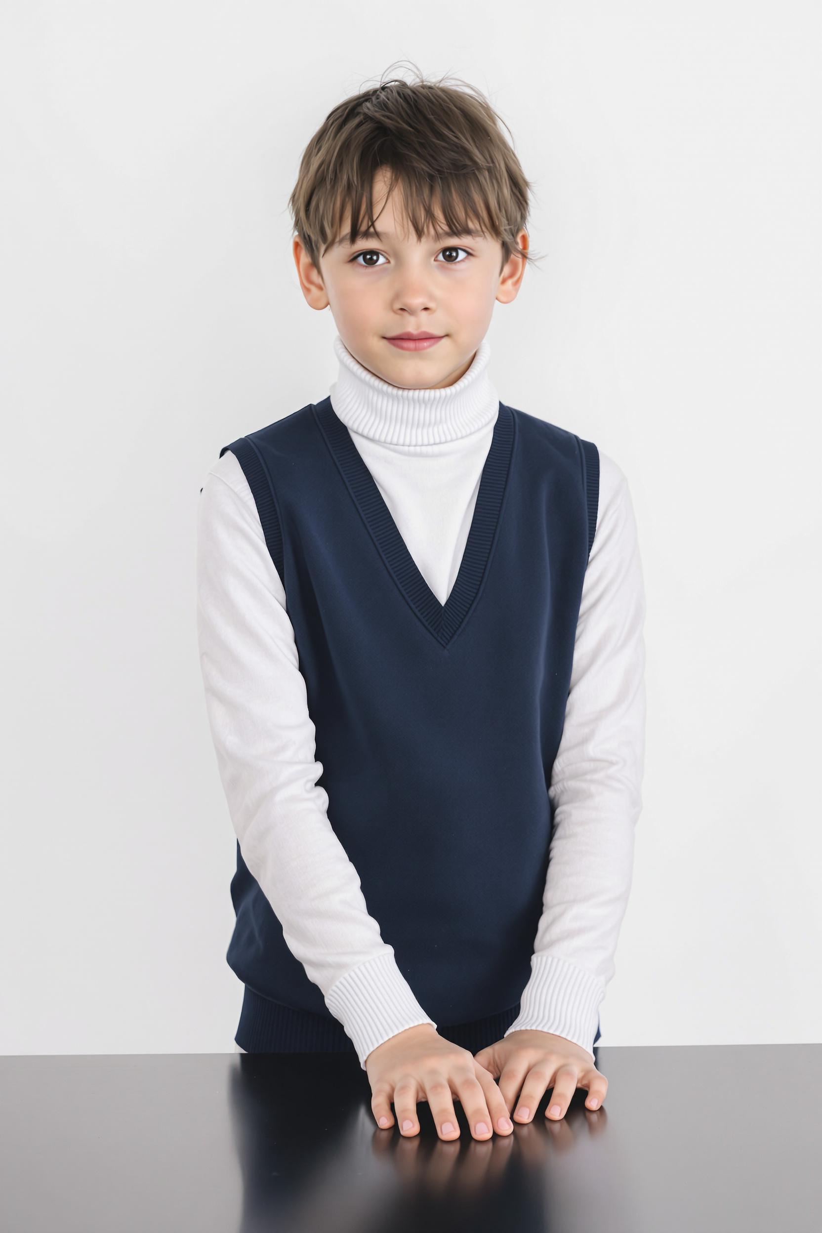 Ребёнок в светлой школьной водолазке и гладкой темно-синей жилетке с V-образным вырезом, строгое расположение рук на парте. Минималистичный белый фон, средний план, прямой контакт глазами с камерой, ощущение праздника 1 сентября.