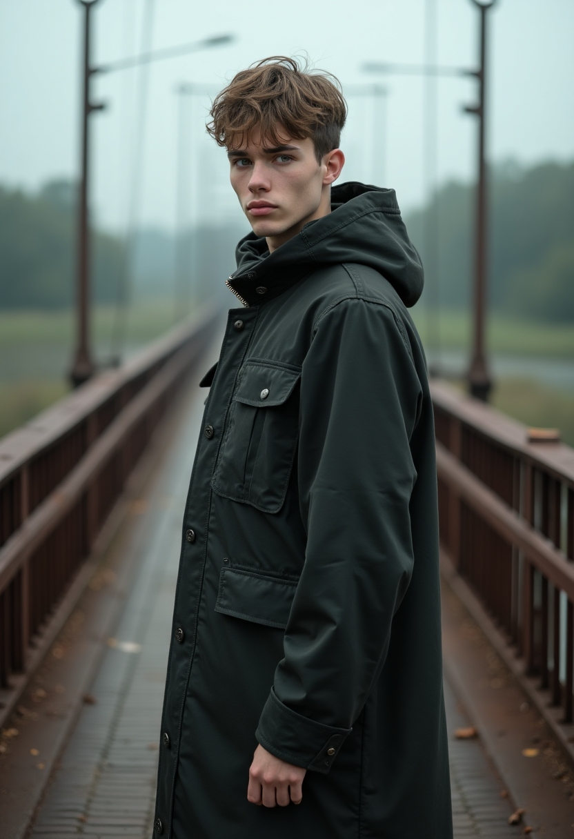 Ржавый мост через реку в зоне отчуждения, на мосту стоит фигура человека в военном плаще