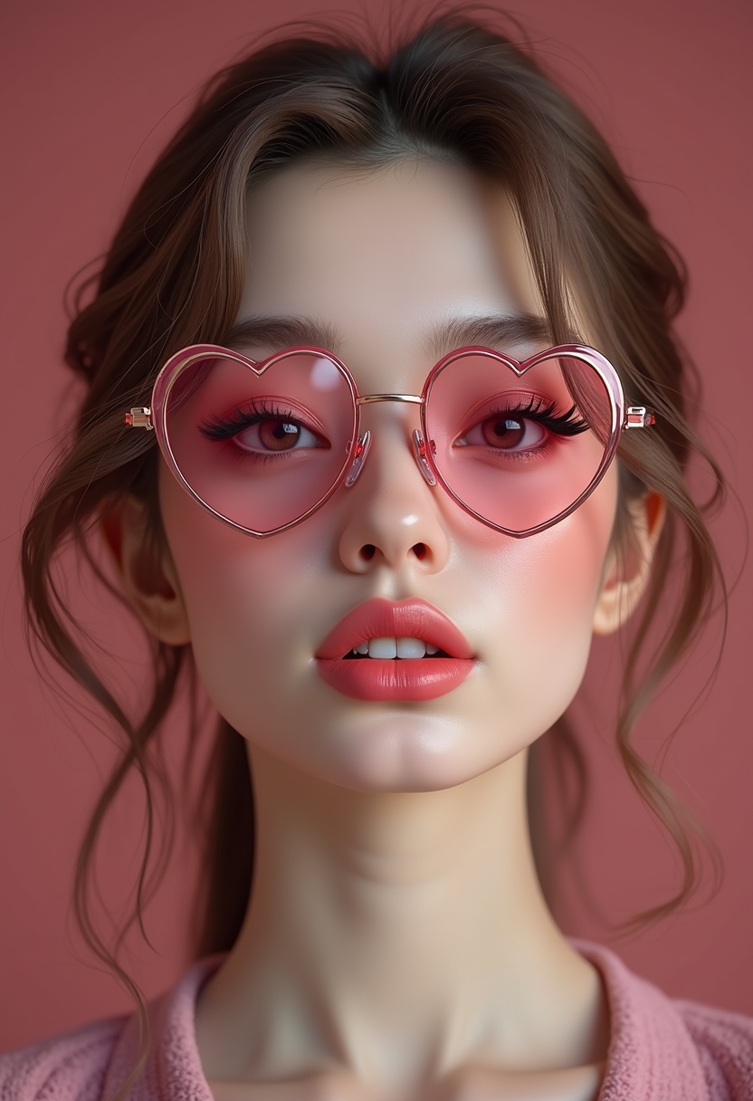С лёгким наклоном головы назад и приоткрытым ртом, она выглядит непринуждённо и соблазнительно. Очки в форме сердца с розовыми линзами отражают свет, а взгляд направлен в камеру. Ультрареалистичный портрет крупным планом в разрешении 8K: выразительные розовые тени на веках, драматичные черные...