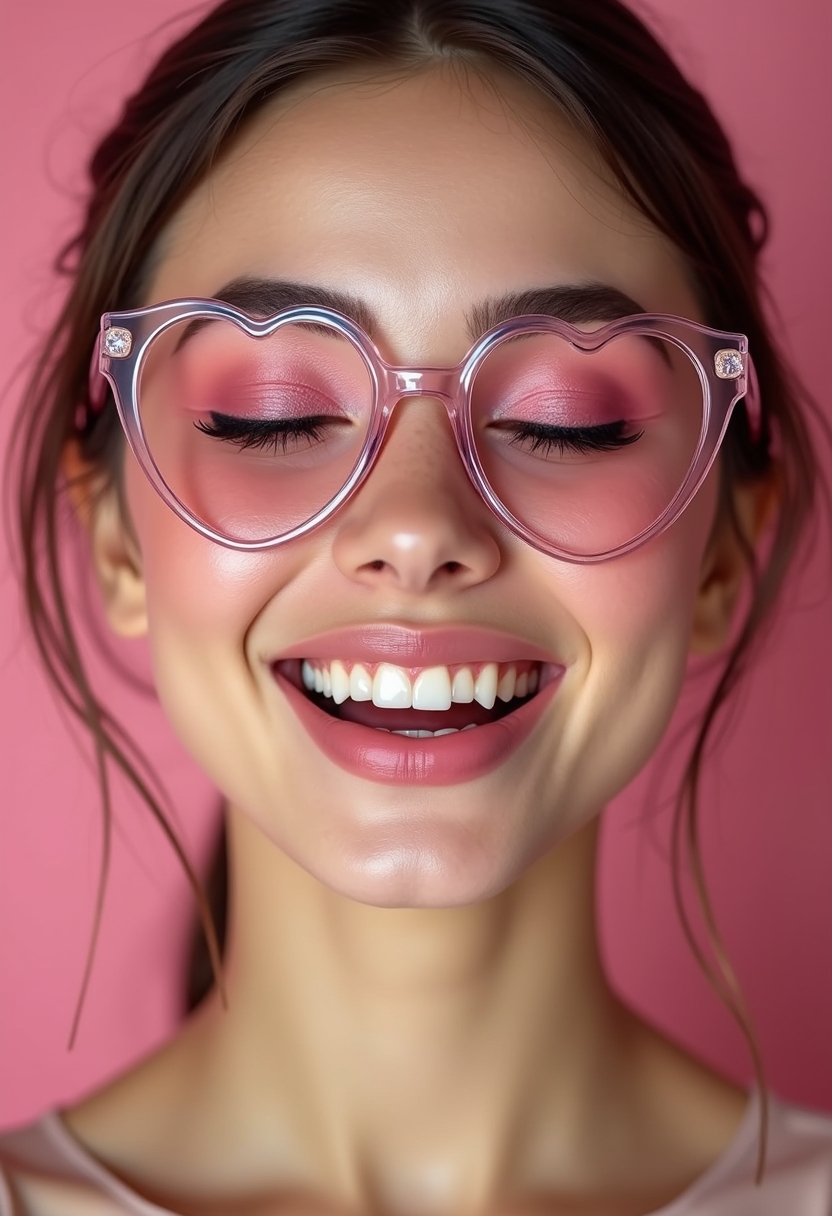 С закрытыми глазами и широкой улыбкой она излучает радость. Очки в форме сердца с розовыми линзами, которые отражают свет, добавляют игривости. Ультрареалистичный портрет крупным планом в разрешении 8K: выразительные розовые тени на веках, драматичные черные подводки для глаз, длинные объемные ресницы и мягкие розовые губы. На фоне насыщенный розовый цвет, гармонирующий с образом. Кожа сияет перламутровым блеском, создавая эффект нежного гламура. Модный, потрясающий, настоящий шедевр.
