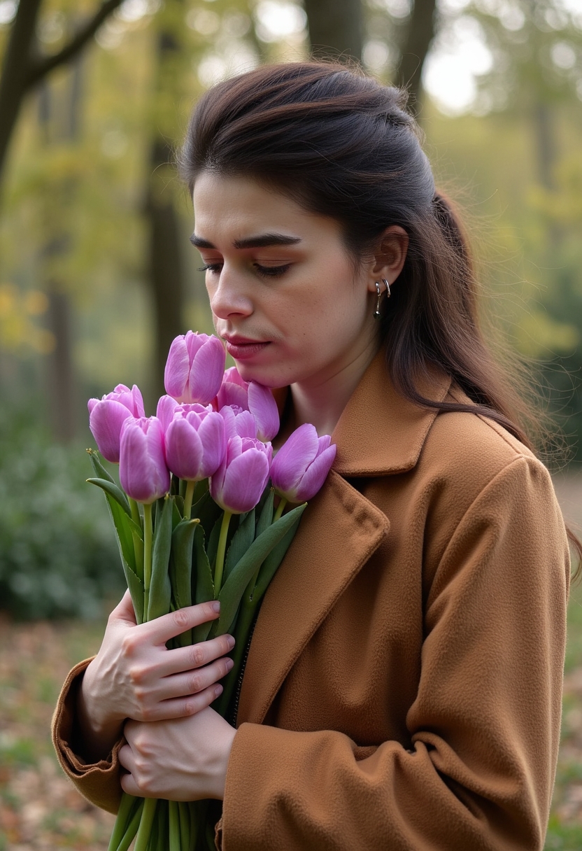 шатенка в карамельном пальто прижимает к груди букет сиреневых тюльпанов, смотрит вниз, солнечные лучи через ветви деревьев.