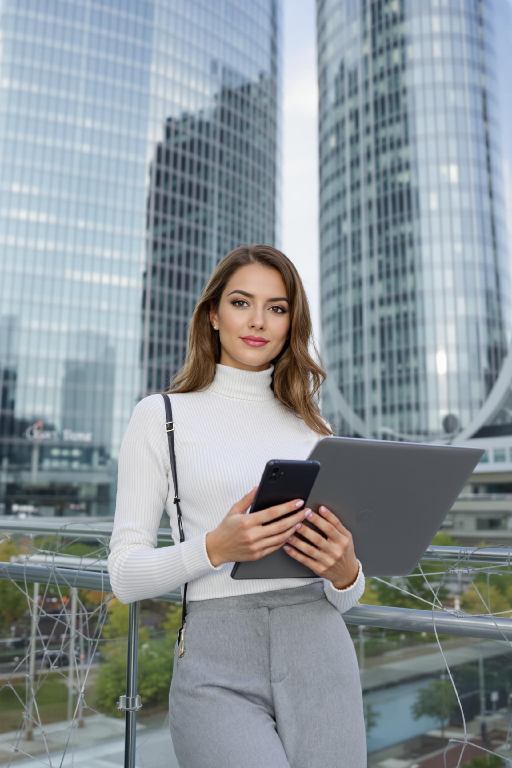 Деловая женщина в тонком бежевом свитере и прямых темных брюках стоит на фоне башен Москва-Сити, держит в одной руке ноутбук, в другой — смартфон, внимательно смотрит в камеру, средний план, вечерний свет большого города.
