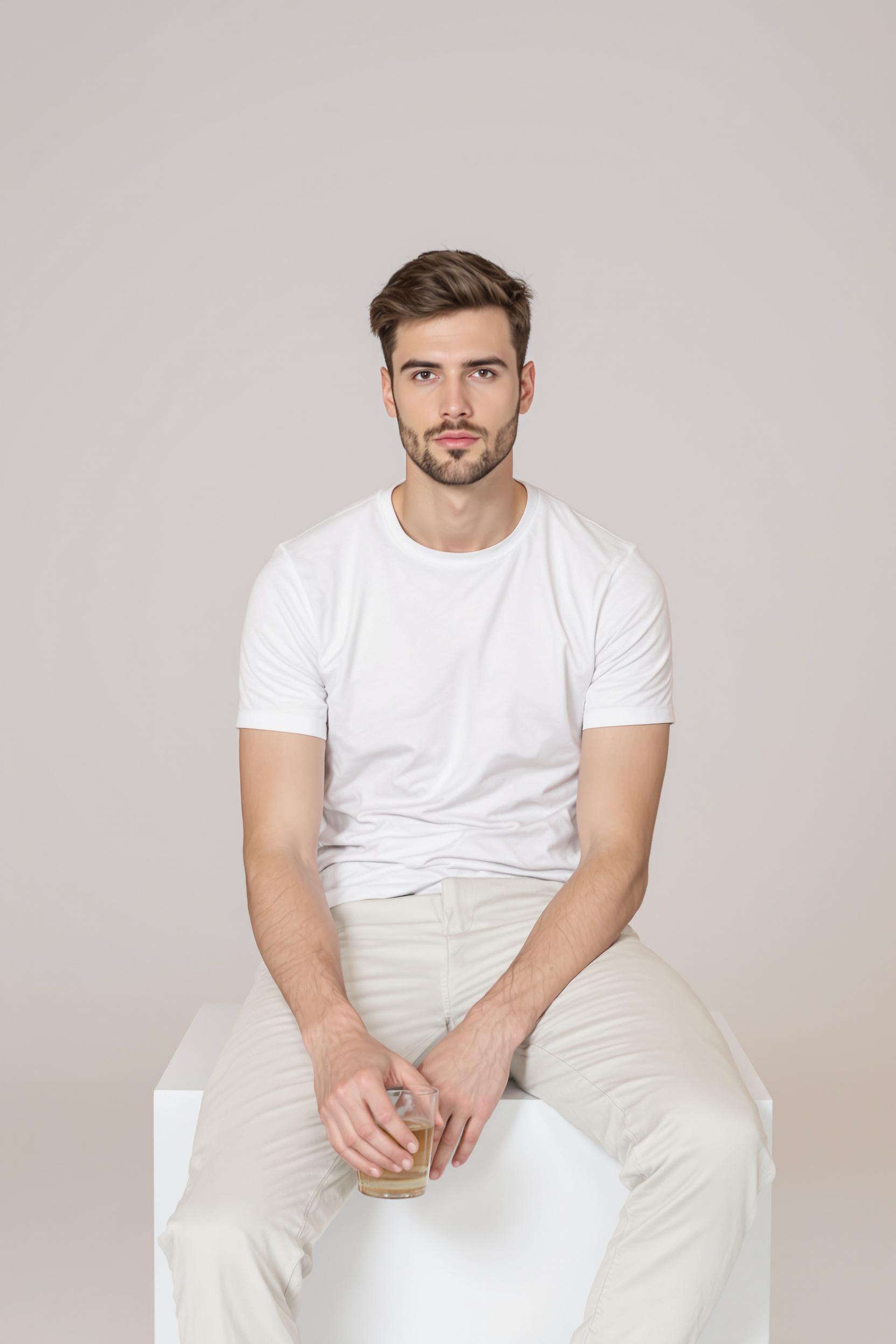 Современный парень в однотонной футболке и светлых брюках сидит на белом минималистичном кубе посреди циклорамы. Взгляд прямо в камеру, одной рукой держит прозрачный стакан воды, вторая свободно лежит на колене. Свет мягкий, атмосфера спокойственная.