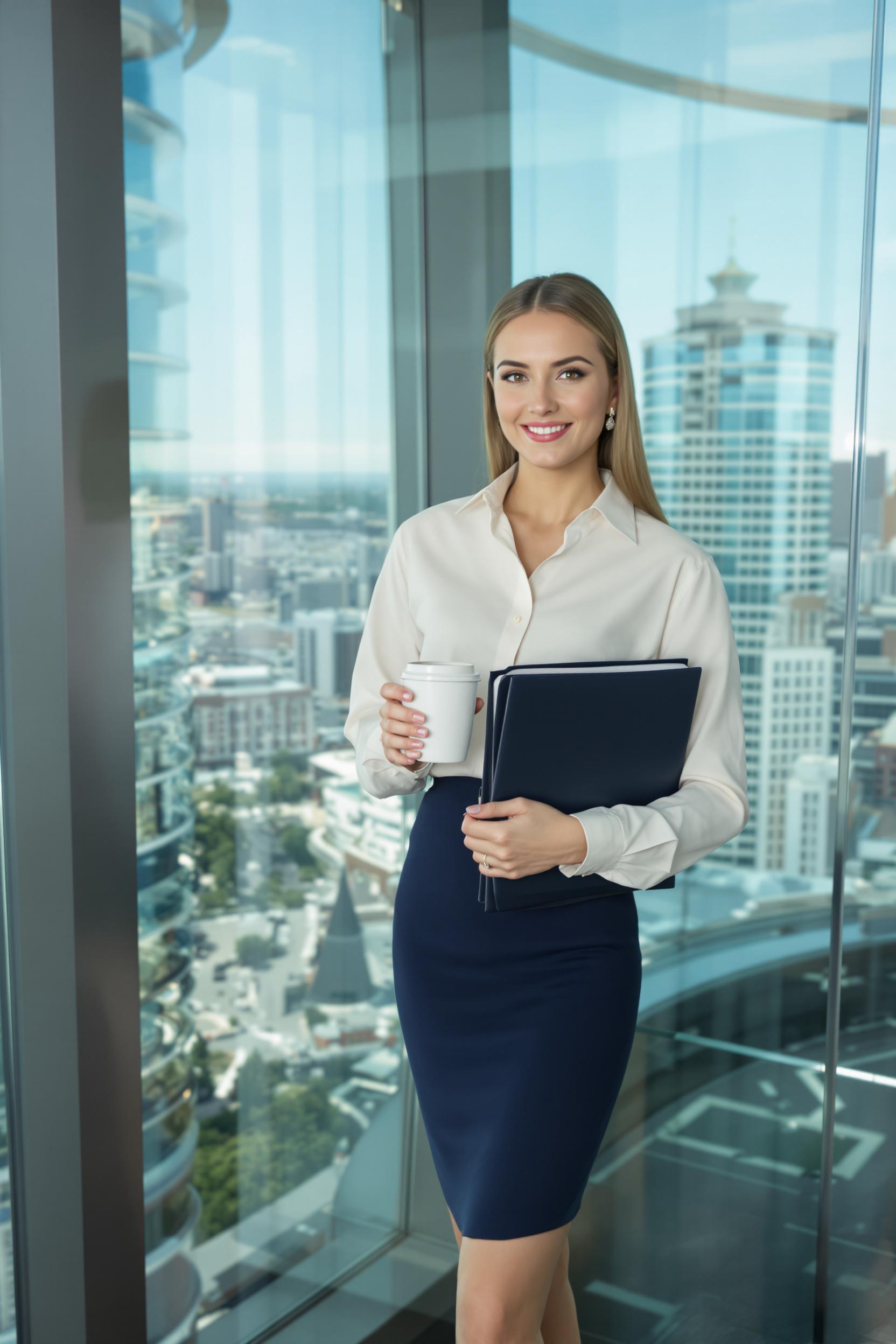 Стильная деловая женщина в светлой рубашке и темно-синей юбке-карандаш, средний план, стоит на фоне панорамных окон бизнес-центра Лахта, держит в руках папку и чашку кофе, уверенно смотрит в камеру, современный городской деловой антураж.