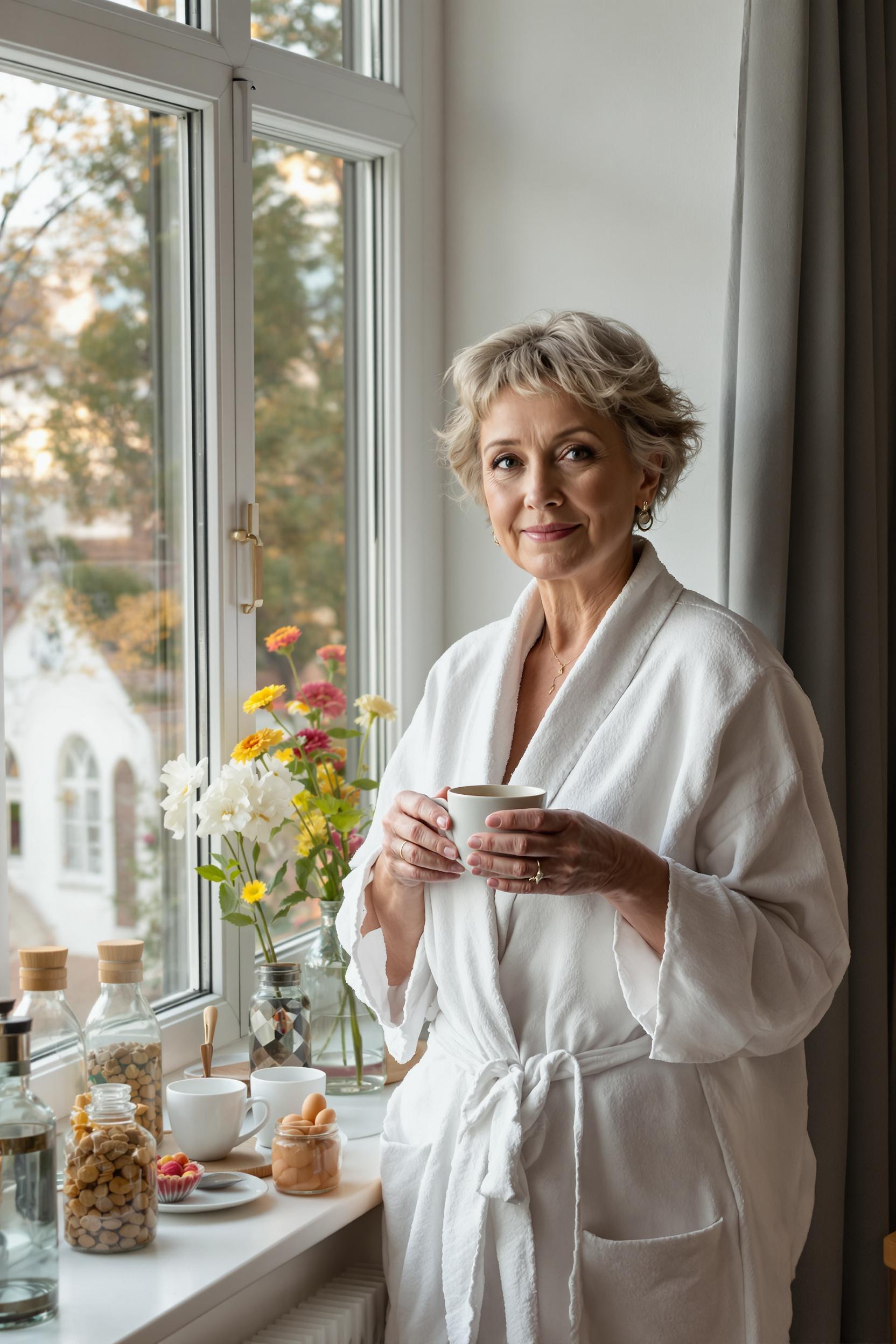 Женщина среднего возраста стоит у большого светлого окна, смотрит прямо в камеру, в руках держит чашку кофе, одета в мягкий белый халат, легкий макияж, свежий завтрак на подоконнике, мягкий рассеянный свет.