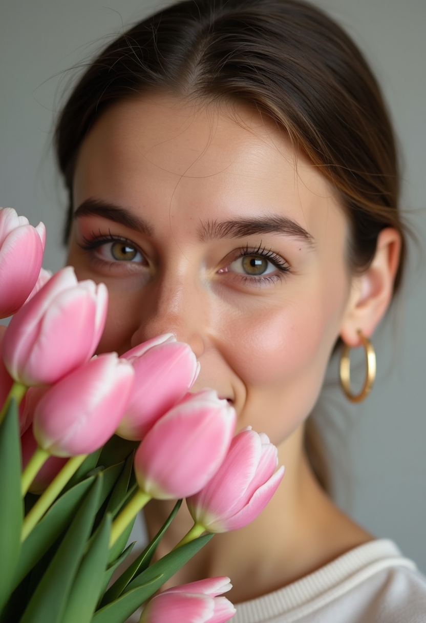 В кадре женщина, частично скрытая за букетом нежных розовых тюльпанов. В ушах небольшие золотистые серьги-кольца.