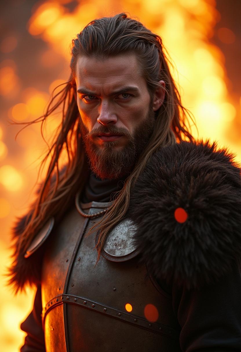 Викинг стоит в доспехах, с суровым выражением лица, на фоне яркого огня. Пламя пылает вокруг, создавая драматическое освещение и подчеркивая мужественные черты его лица. Его длинные волосы развиваются на ветру, а глаза полны решимости. Объектив фокусируется на его фигуре, отбрасывая тени, которые усиливают атмосферу. Мрачный, но величественный внешний вид викинга гармонирует с огненными языками, создавая мощный контраст. Крупный план.