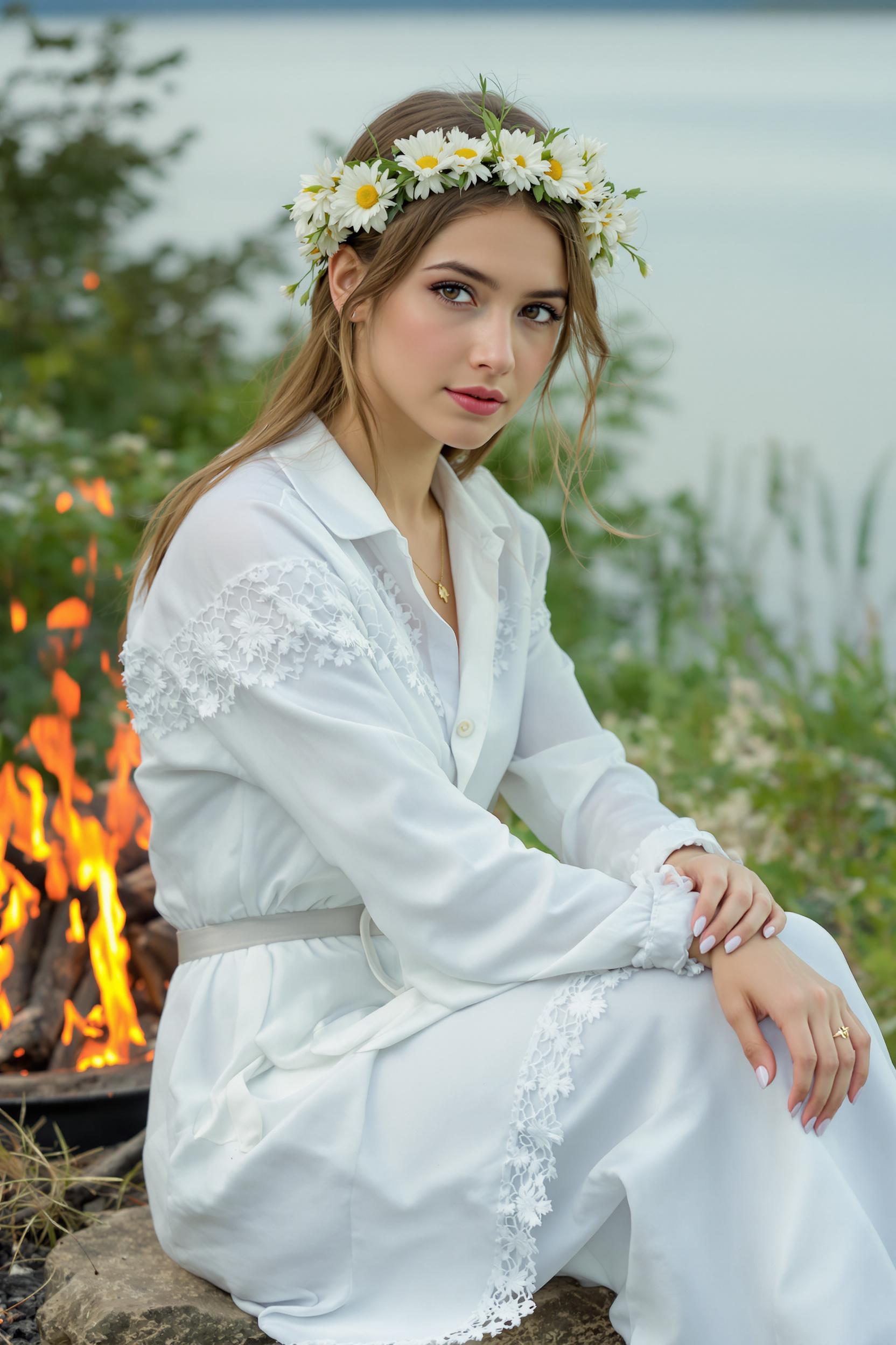 Молодая женщина стоит у реки на закате, позирует в белом хлопковом сарафане с вышивкой, на голове пышный венок из полевых цветов. За ней мерцает костёр. Она смотрит прямо в камеру, одна рука аккуратно держит подол платья.