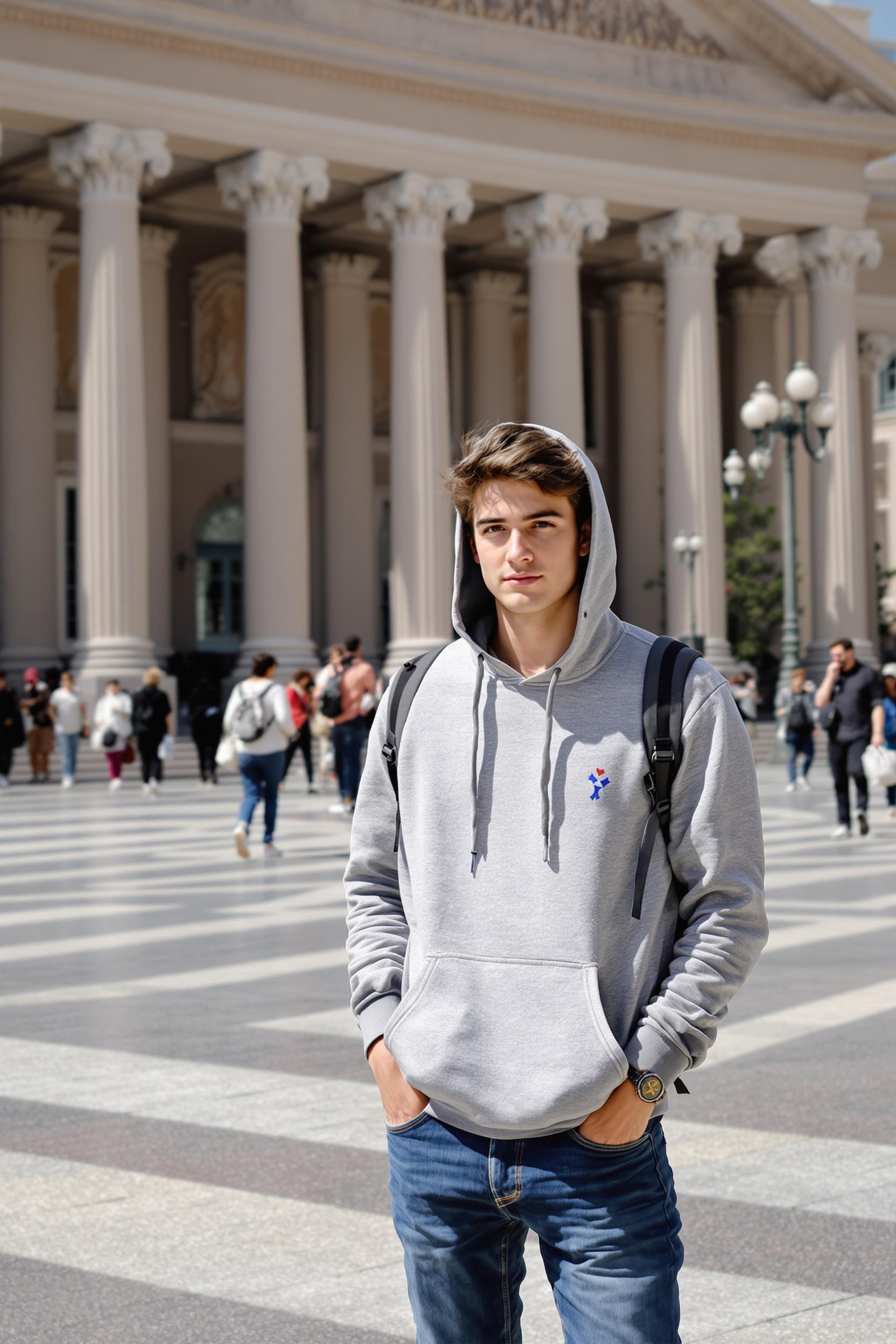 Юноша в худи и джинсах стоит на просторной городской площади у здания с колоннами, смотрит прямо в камеру, вокруг проходят люди, солнечный день, видны элементы городской архитектуры и уличные фонари.