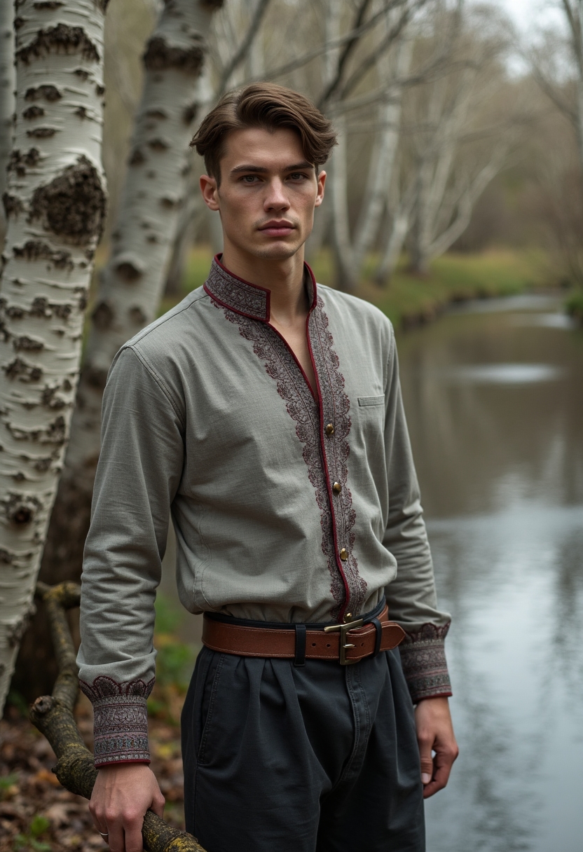 Юноша в серой льняной рубахе с бордовой вышивкой по вороту и манжетам, темные штаны, мягкий кожаный пояс, стоит среди берёз у ручья, одной рукой держит ветку, корпус слегка повернут, внимательно смотрит в камеру, прохладное майское утро, минимализм.
