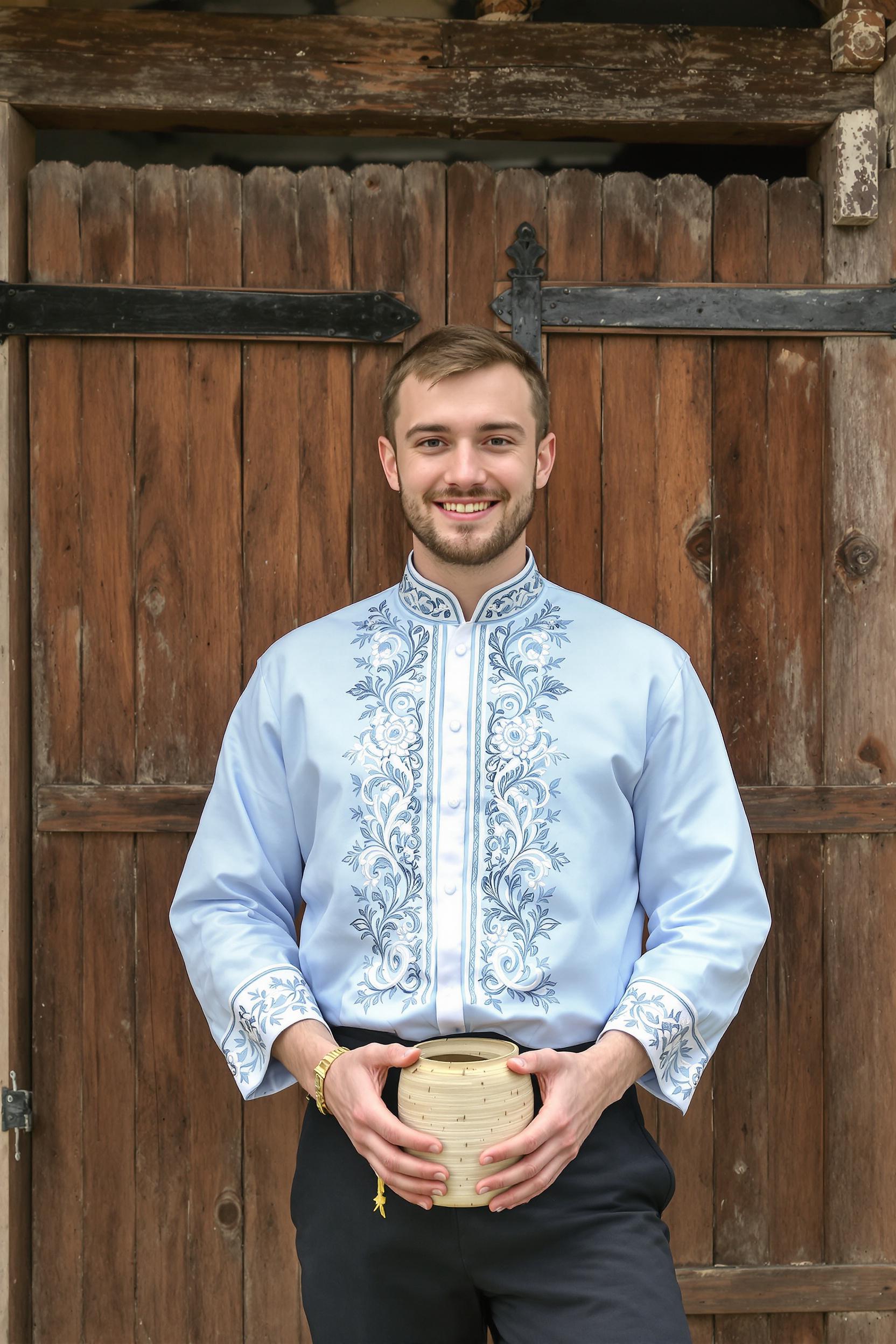 Примерить образ на себеЮноша в светло-синей косоворотке с серебристой вышивкой и тёмных брюках стоит на фоне деревянных ворот деревенского дома. Он держит в руках берестяную туеску и смотрит прямо в камеру с тёплой приветливой улыбкой. Средний план, дневное мягкое освещение.