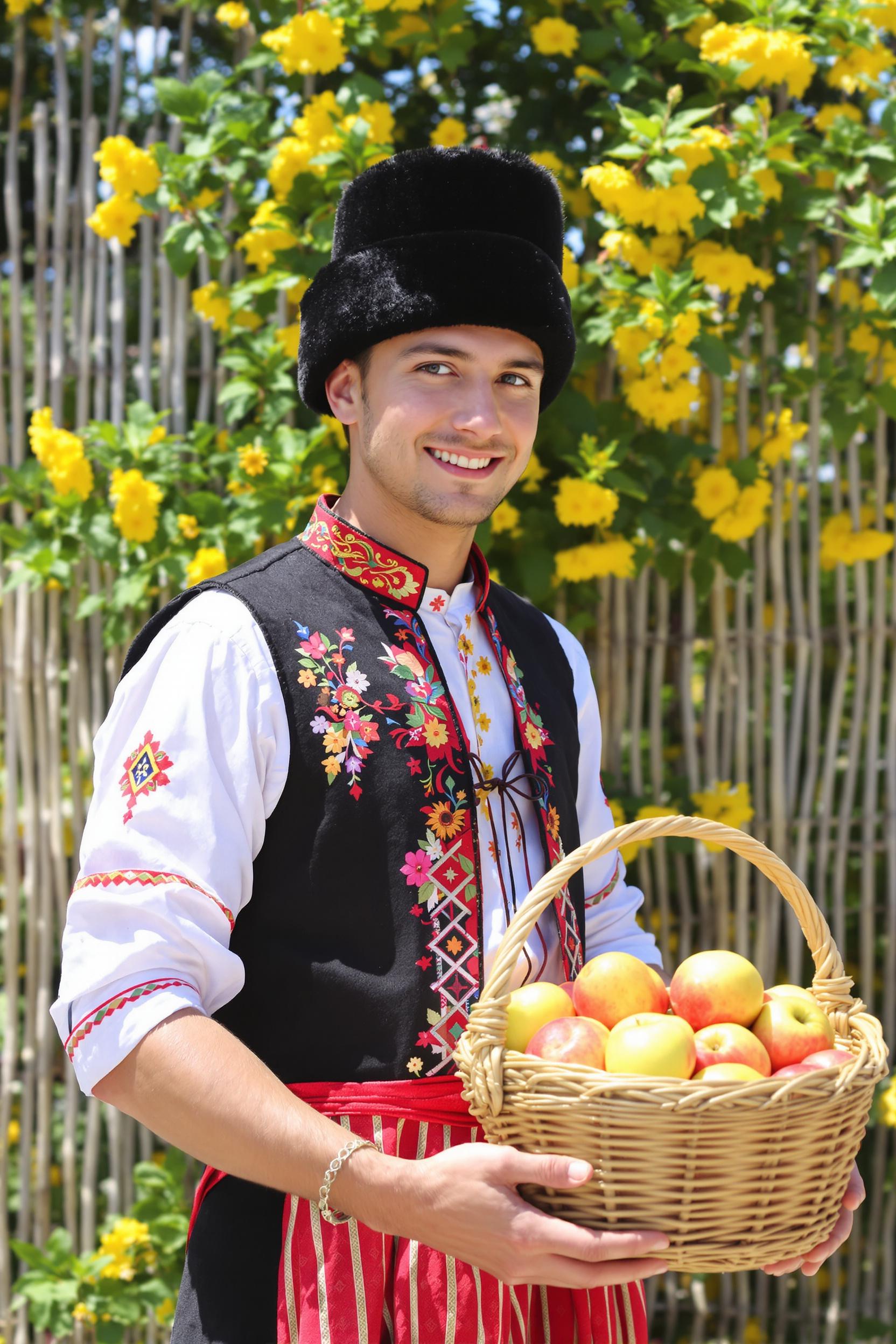 Мужчина в традиционном русском костюме с черной шапкой-ушанкой и пестрой косовороткой стоит у плетня, украшенного полевыми цветами. В руках он держит плетеную корзину с яблоками, смотрит прямо в камеру с теплой улыбкой. Средний план, летний солнечный день.