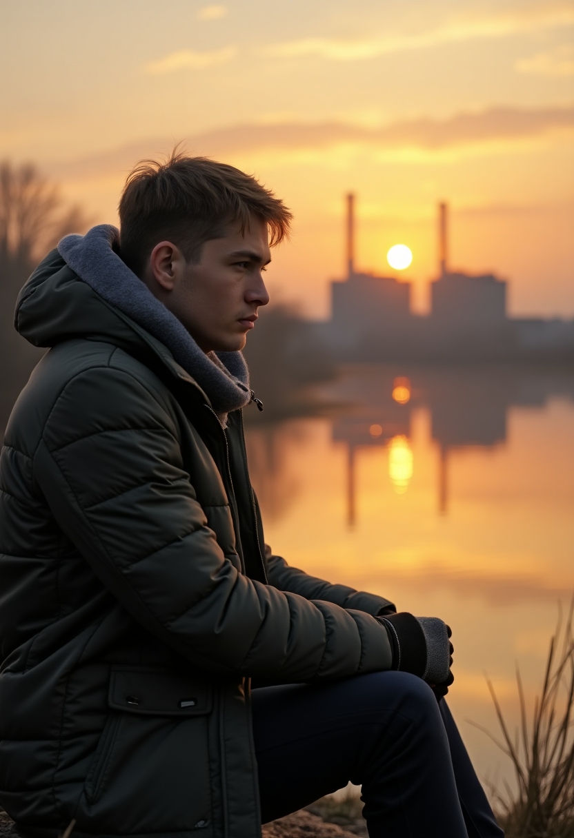 Закат над реактором Чернобыльской АЭС: мужчина в тёплой одежде сидит у реки и смотрит вдаль