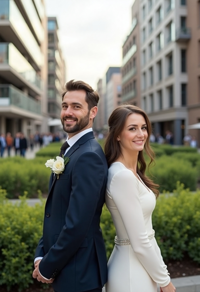 Примерить образ на себеЖених и невеста стоят на фоне оживлённой городской площади, повернувшись друг к другу плечами, оба смотрят прямо в камеру с счастливым выражением, за ними современные здания и зелёные кусты, мягкий дневной свет.