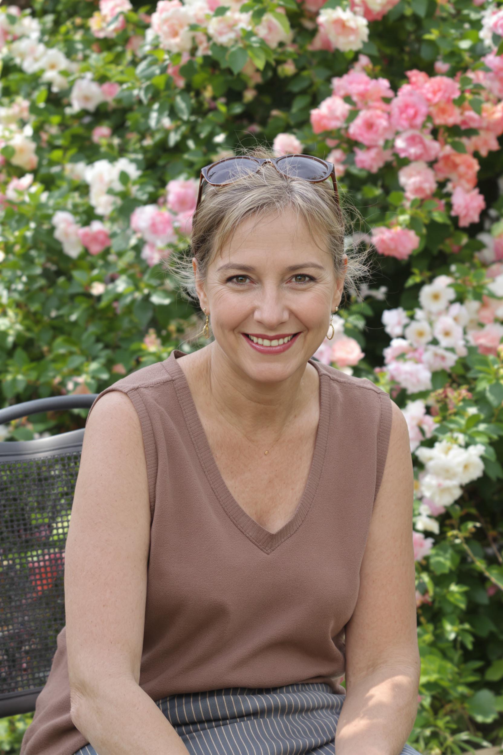 Женщина 55 лет сидит в уютном саду, улыбается и смотрит прямо в камеру, за спиной цветущие кусты, мягкий естественный свет, спокойная и уверенная атмосфера, нежные пастельные тона.