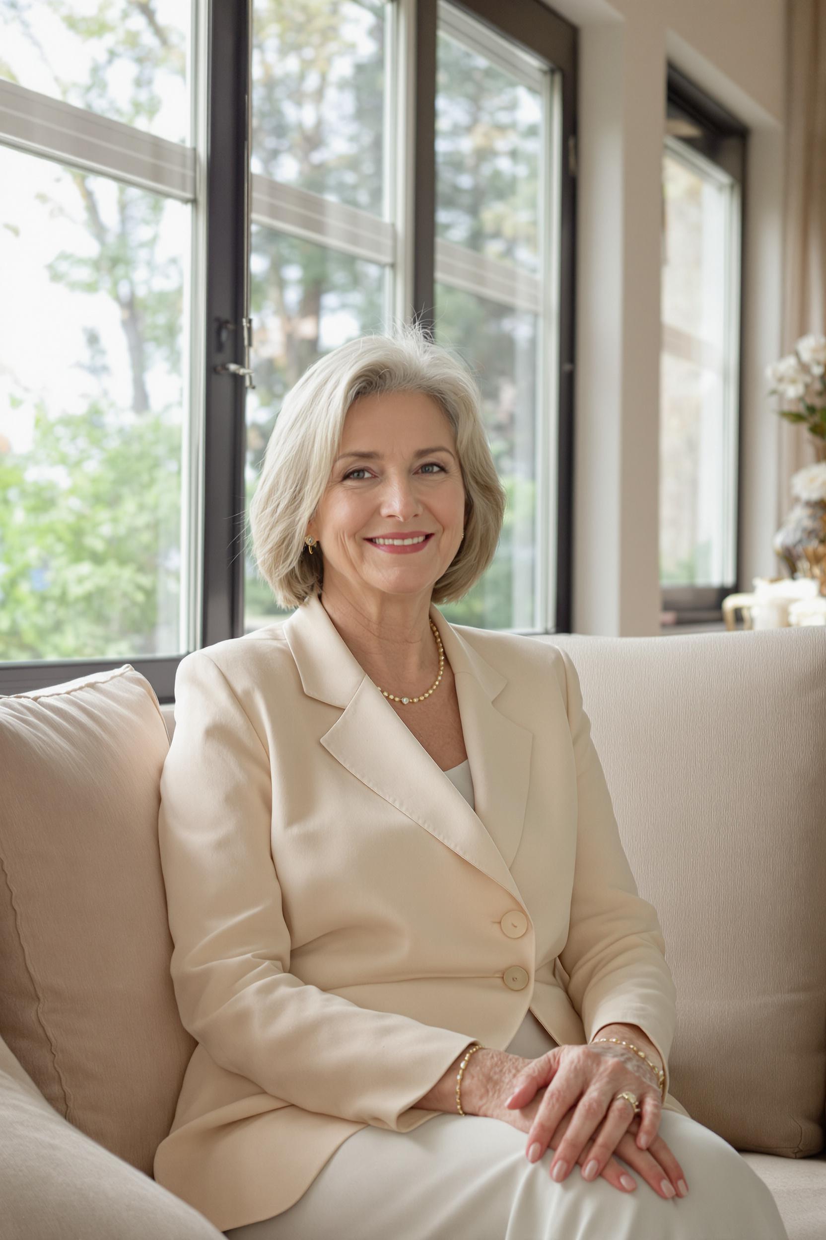 Примерить образ на себеЖенщина 55 лет, сидит в уютном светлом интерьере с большими окнами, мягкий дневной свет, элегантная одежда пастельных тонов, легкая улыбка, уверенно смотрит в камеру.