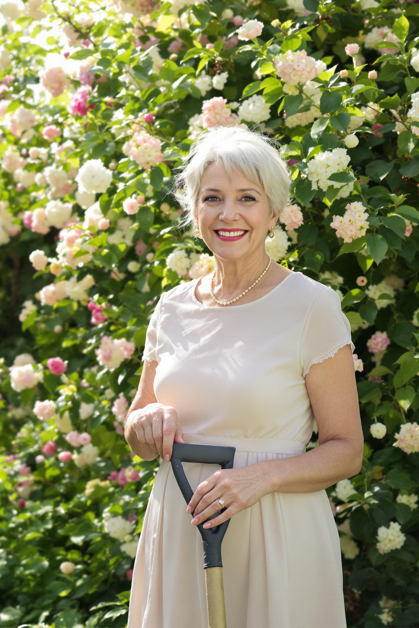Женщина 55 лет стоит в саду у цветущих кустов, одета в лёгкое платье, мягкий дневной свет, смотрит прямо в камеру, на лице доброжелательная улыбка, лопата в руках.