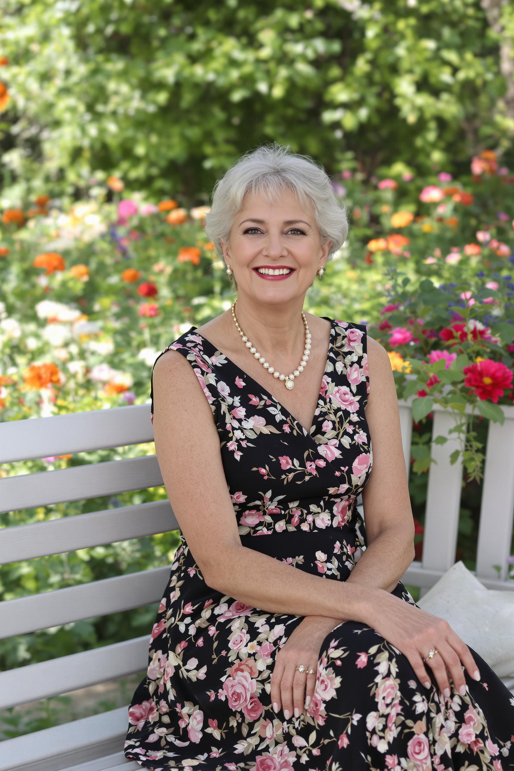 Женщина 55 лет, светлые волосы, элегантное платье в пастельных тонах, стоит среди цветущего сада, мягкий дневной свет, смотрит прямо в камеру, спокойная улыбка, зелёная листва на заднем плане.