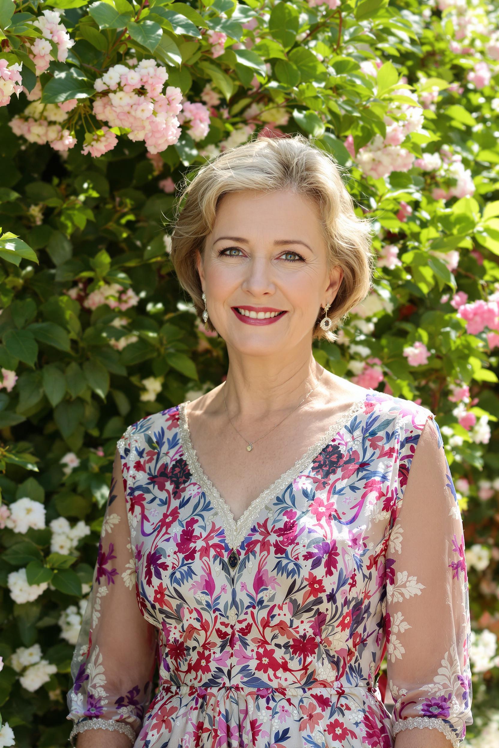 Женщина 55 лет в элегантном платье, стоит в цветущем саду, мягкий солнечный свет, зелёная листва вокруг, уверенный взгляд в камеру, естественная поза, тёплая атмосфера.